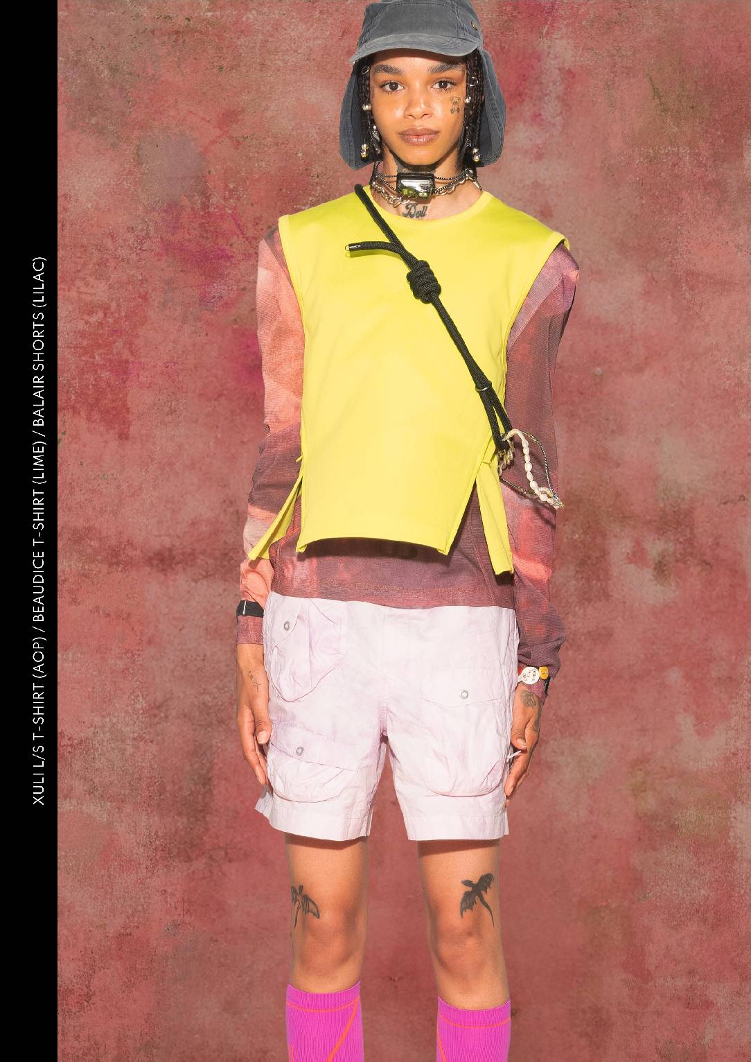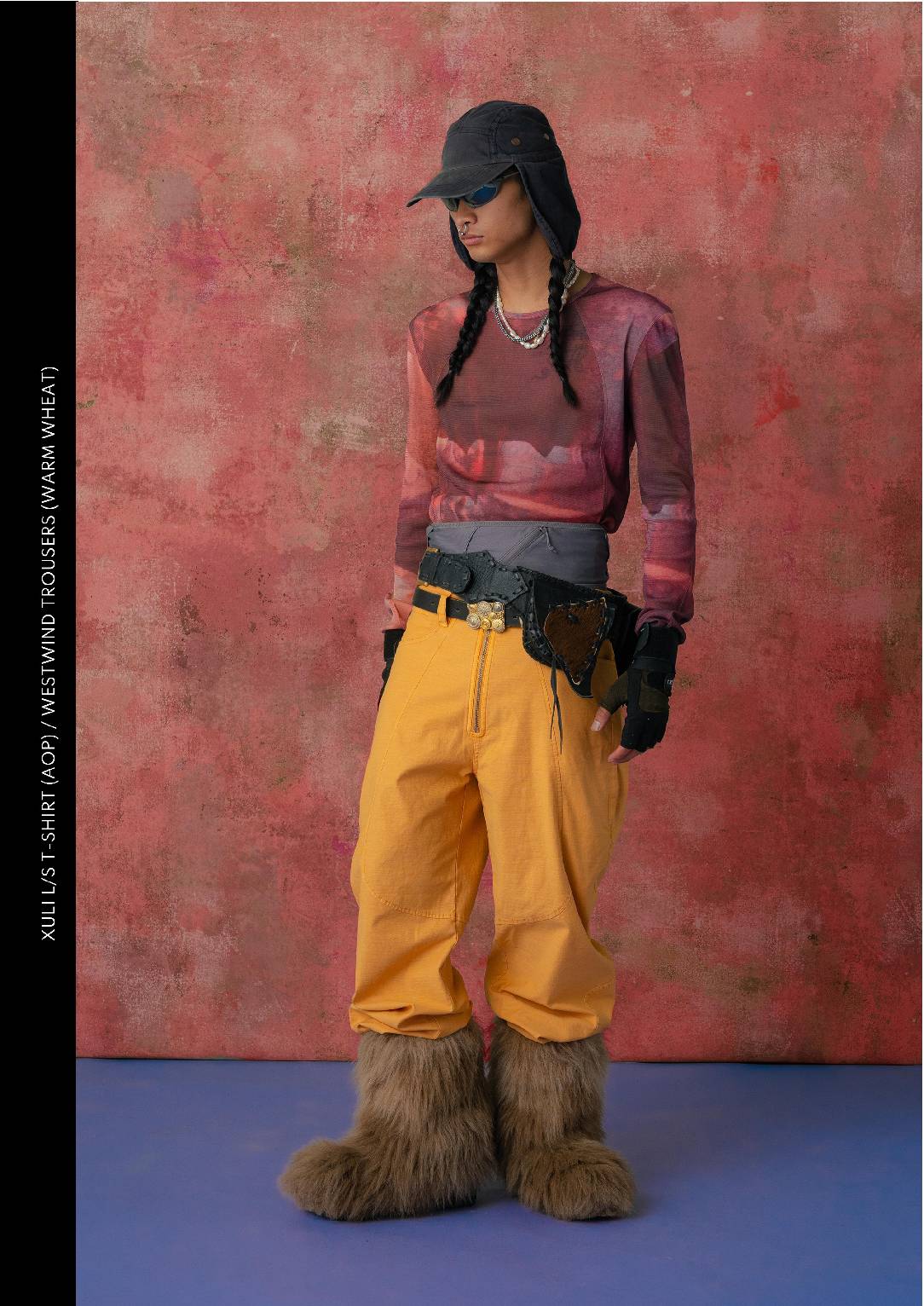 本季,A. A. Spectrum 光谱 携⼿法国艺术家 Sandy Avignon,以其标志性的创作⼿法——通过叠层 重构古代中国寺庙与废弃法国教堂的图像,创造出梦幻⽽真实的艺术作品。这些雾⽓般的印花被应 ⽤于透明微⽹⾯料制成的 XULI Long-sleeved T 恤上,与系列跨⽂化、跨时代的主题完美呼应。