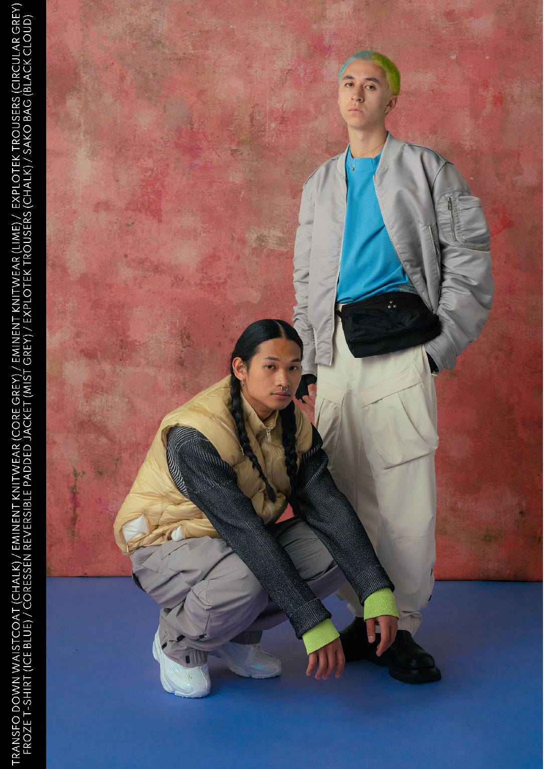 「柔甲」⼀词源⾃中国古代诗⼈对春天新⽣嫩叶的⽐喻。对我们⽽⾔,植被如同地球的柔软铠甲, 保护着⼤地免受阳光的炙烤。尽管全球变暖或许不可逆转,环保议题也常被忽视,但我们仍希望通 过设计为⼈类打造「柔甲」,以应对当下的⽓候挑战。本系列既如铠甲般提供保暖与防护,⼜如植 被般柔软舒适,旨在唤起⼈们对⾃然与环境的关注。
