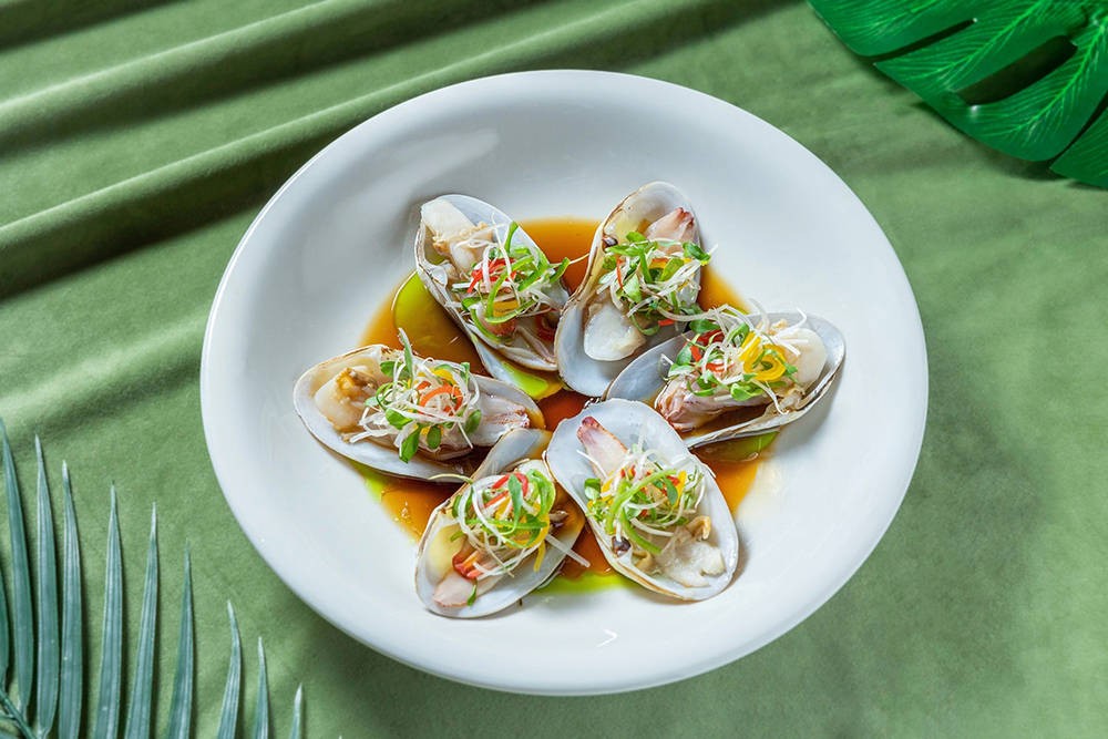 细嫩的象拔蚌仔在这道轻盈菜式中担当主角,搭配酸甜的醋汁,为春日餐桌增添一抹清新气息。