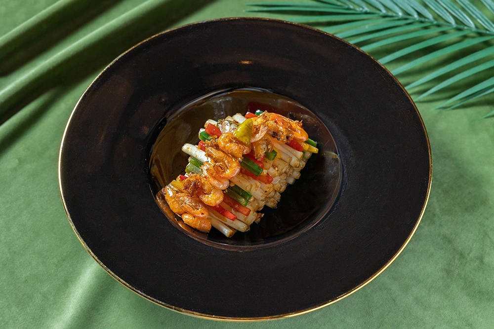 这道独特的春季佳肴将新鲜花生芽的清脆与河虾的鲜美结合,佐以香浓的自制 XO酱提升整体风味。