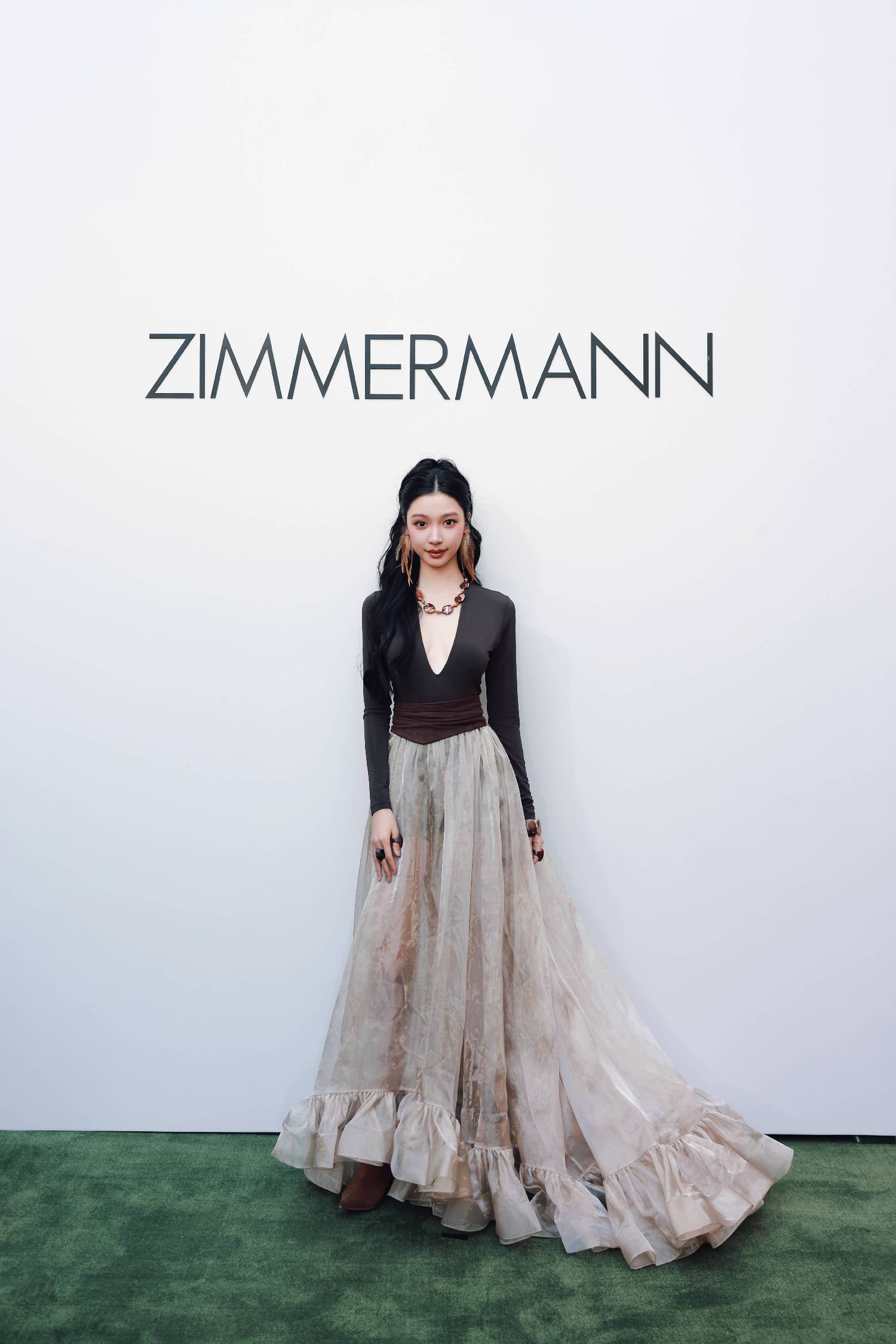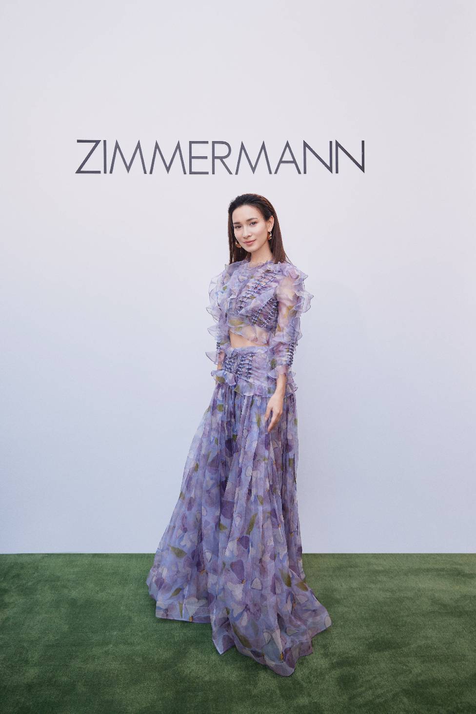 新人演员、时尚博主易梦玲身着 ZIMMERMANN 2025春季成衣系列 DAWNING 连体衣及长款半身裙,幻彩流光间诠释自然灵感与现代设计交织的自由美学。