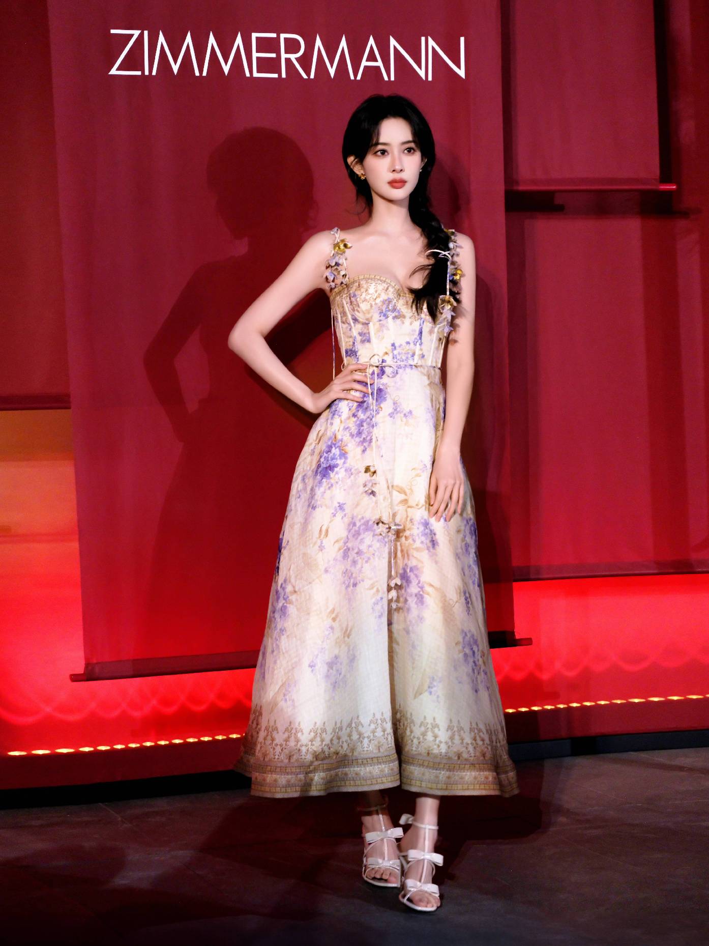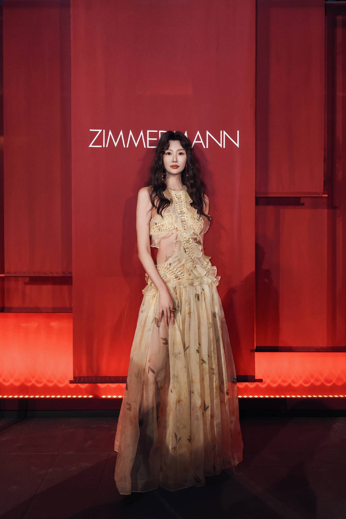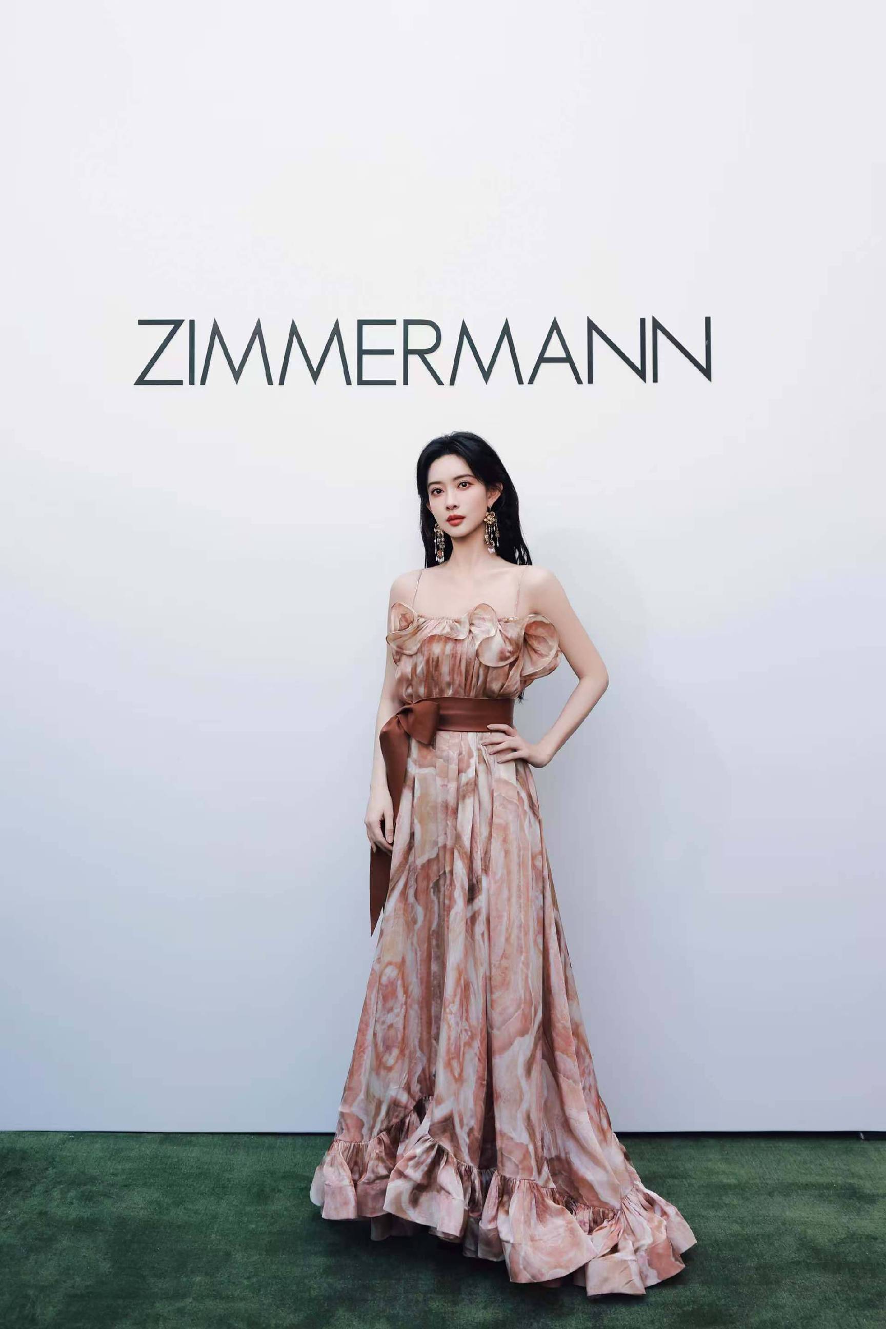 演员孟子义身着 ZIMMERMANN 2025春季成衣系列 ILLUMINATE 荷叶边吊带礼服裙, 大胆色彩晕染赋予灵动俏皮个性,玛瑙图案彰显华丽浪漫韵味。