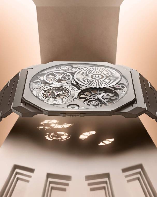 宝格丽对超薄腕表的不懈追求可追溯至2014年。彼时,Octo Finissimo陀飞轮手动上链腕表横空出世。自那时起,宝格丽通过各个品类的持续创新,不断刷新品牌超薄腕表纪录,包括2016年发布的Octo Finissimo三问腕表(3.12毫米)、2017年推出的Octo Finissimo自动上链腕表(2.23毫米),以及2021年问世的Octo Finissimo万年历腕表(2.75毫米)。其中,Octo Finissimo万年历腕表问鼎日内瓦高级钟表大赏(GPHG)久负盛名的“金指针奖”(Aiguille d’Or)。自2012年面世以来,Octo系列便迅速成为现代制表界的标志性设计。而在Octo系列诞生十周年之际,Octo Finissimo Ultra腕表凭借仅1.8毫米的整体厚度成为实至名归的超薄腕表力作。为了欢庆Octo Finissimo Ultra腕表的到来,宝格丽还在罗马市中心万神殿前的罗通达广场(Piazza della Rotonda)举办了一场发布盛宴。随后,Octo Finissimo Ultra腕表斩获GPHG“大胆设计奖”(Prix de l'Audace)。自2022年以来,此款腕表已使用8项核心创新技术。