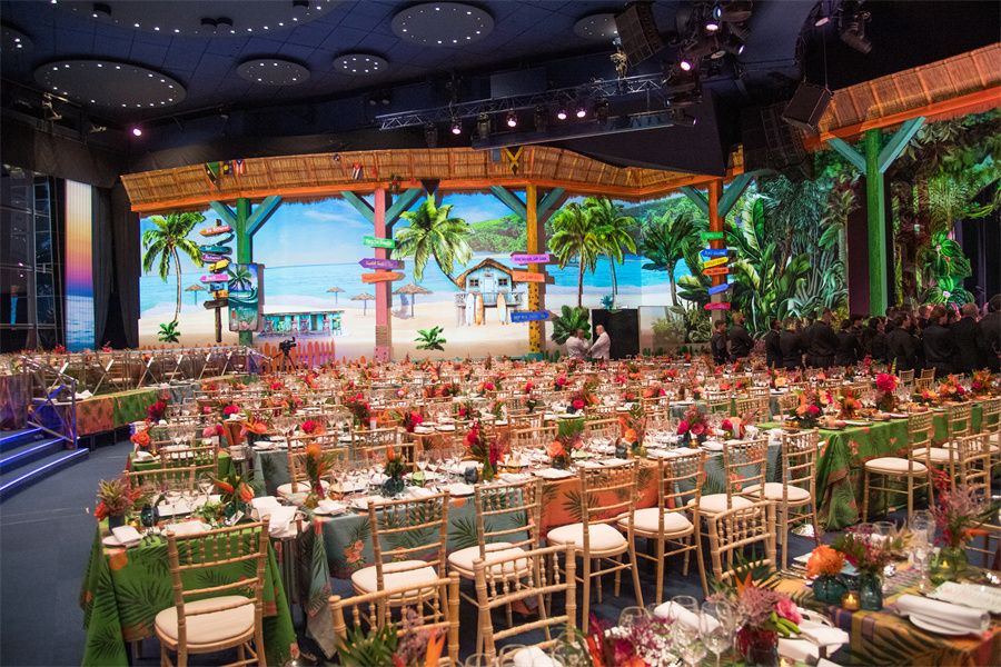 蒙特卡洛星际大厅(Salle des Etoiles)的入口被设计师打造成一片风格鲜明的热带日落森林,并借由一条小径唤起宾客对加勒比日落时分温暖夜晚的回忆。舞台上的装饰更是令人惊艳,一座由经过海水和阳光风化的木板制成的标志性吧台矗立于此,向宾客发出派对和狂欢的邀请。吧台的装饰就像一个剪贴画:棕榈树、郁郁葱葱的热带森林、标牌、果汁车和象征加勒比海的遮阳伞混合在一起,背景板上装有视频映射,让海滩装饰栩栩如生,并随着夕阳西下而熠熠生辉。