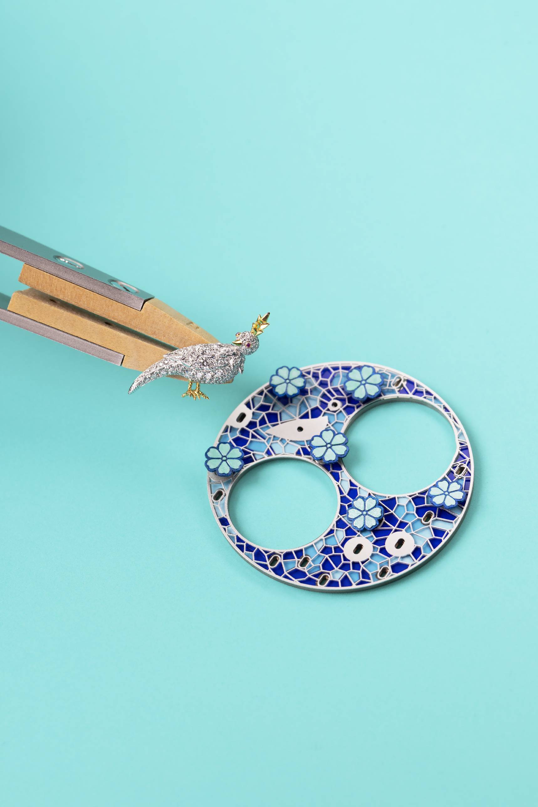 除总耗时80小时的珐琅与漆绘工艺外,表盘上的精巧小鸟亦由蒂芙尼金匠与宝石镶嵌大师联手打造。小鸟由18K白金与黄金手工雕刻而成,并镶嵌70颗钻石,总耗时40小时。