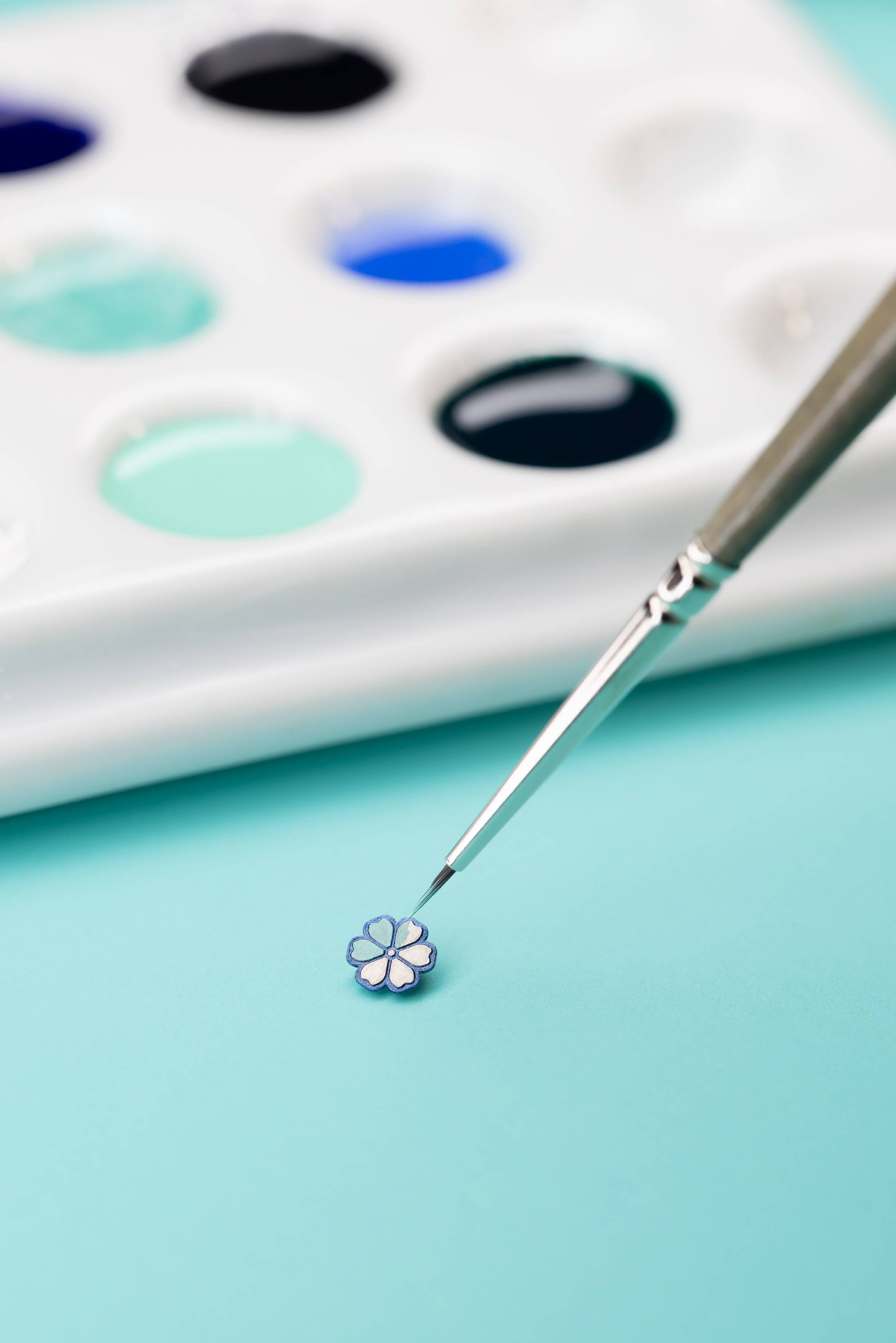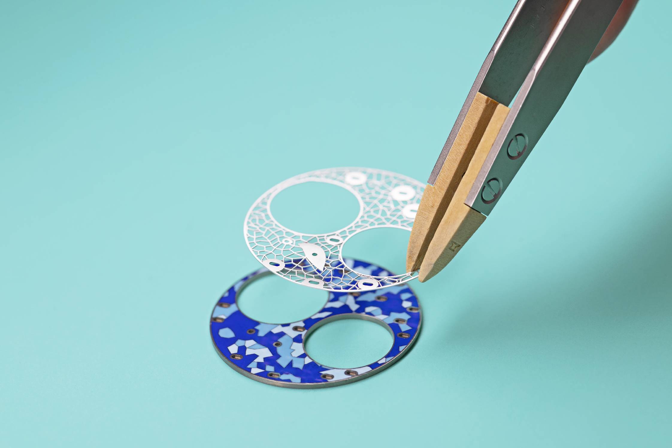 采用内填珐琅(champlevé,法语意为“凸起区域”)工艺时,需先在平整的18K黄金圆盘上精心雕琢出凹槽,仅保留凸起的金属轮廓以分隔不同色彩的珐琅区域。 随后,工匠以高超的精准度,手工施涂珐琅釉彩,每道釉层皆十分纤薄,在层层叠加中淬炼出色彩的浓度与层次,直至釉面绽放出宝石般通透莹润的光泽,并与凸起的金属轮廓严丝合缝。此次,蒂芙尼为这款腕表新作选择了三种不同的蓝色调。每层釉彩涂抹后,都需在超过800摄氏度的高温中烧制,再经细致冷却,釉面稳固后进行下一层上色。内填珐琅工序结束后,工匠以微米级的精准度,将18K白金细丝与分隔珐琅色彩的蕾丝状金属轮廓相贴合。最后,手工漆绘的花卉图案以两层布局精心铺展于表盘上,进一步增加视觉深度。