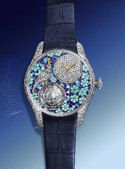 腕表表盘集五种精湛技艺于一身,包括内填珐琅、漆面工艺、微型黄金雕刻、钻石镶嵌及蓝宝石水晶手工刻面。