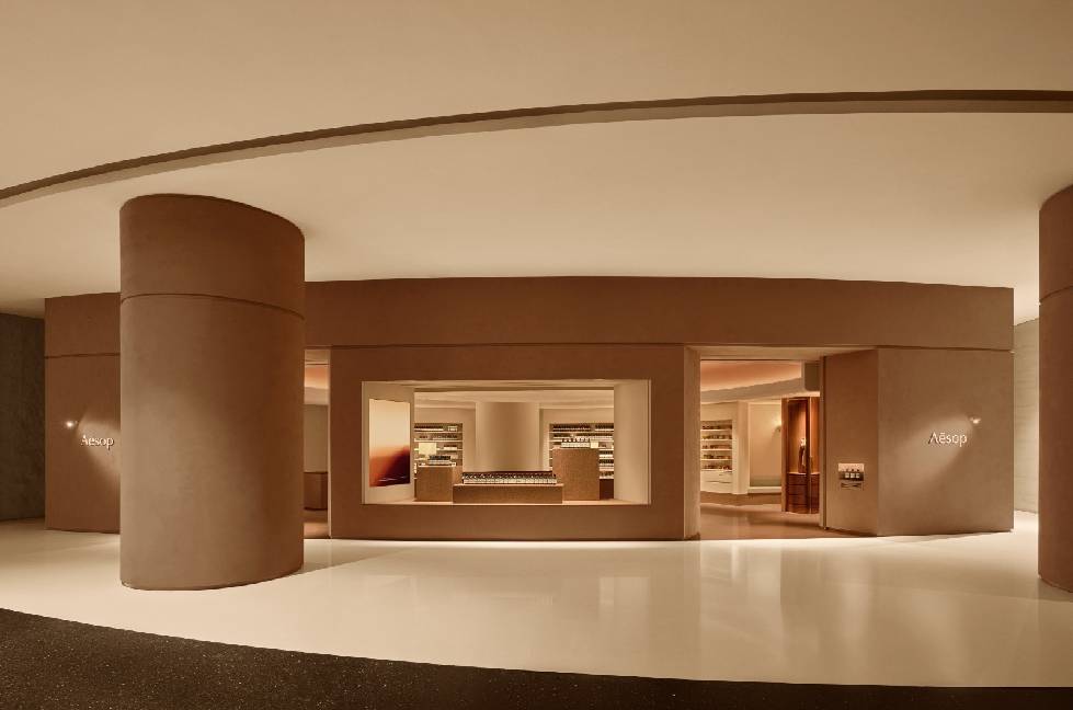 这些看似独立的场域,被由回收琥珀瓶制成的水磨石巧妙串联,使产品与空间和谐共生。这种连贯性不仅存在于店内,更进一步延展至空间之外:购物中心长廊的两根立柱也被覆上与店铺外立面相同的温暖赤陶色,映衬着店中外圆的另一半,使空间的秩序感自然延续。