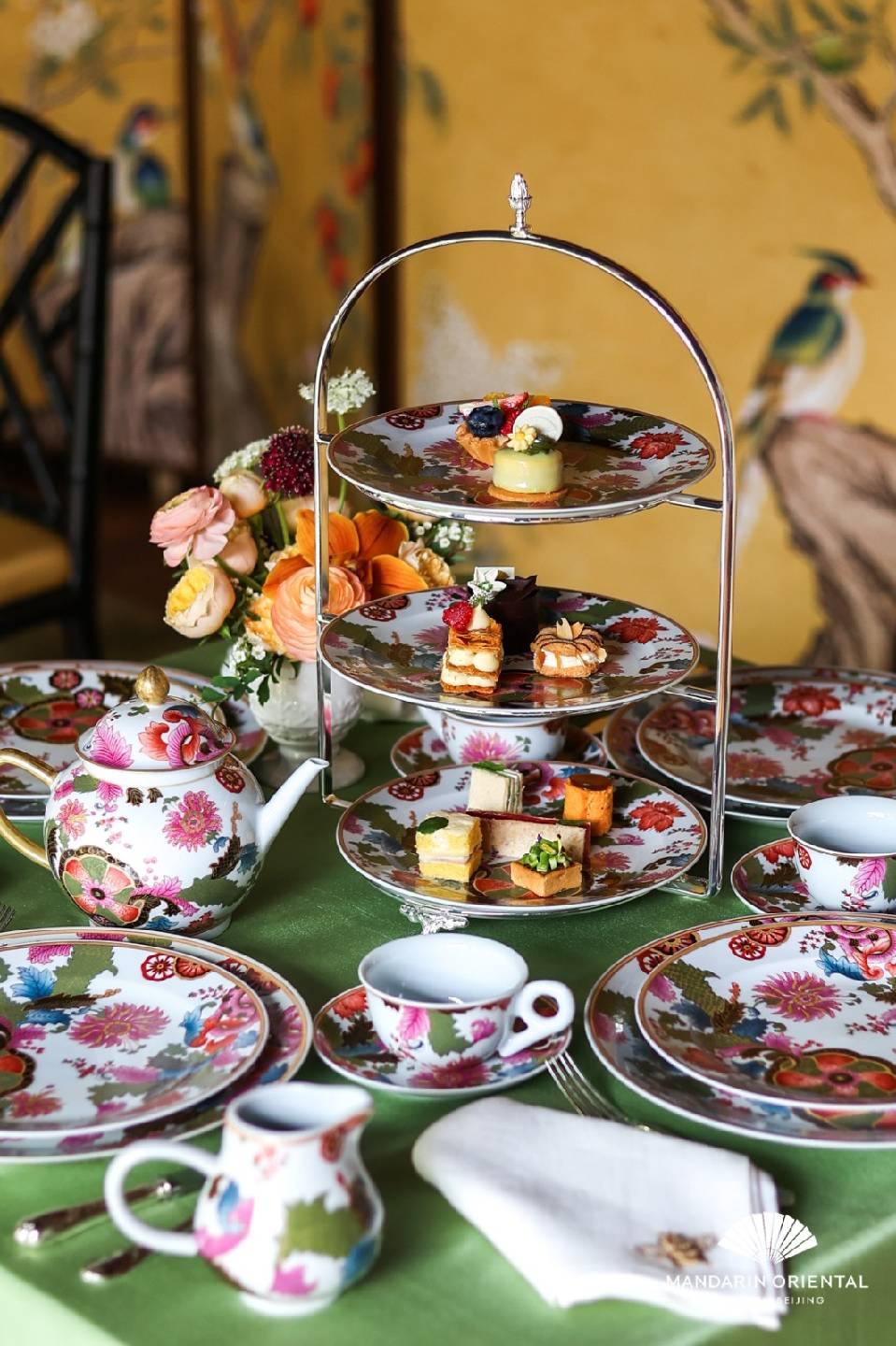 与艺术空间相配的是来自北京前门文华东方酒店精心呈现的英式下午茶套餐。此次,主厨从de Gournay画师所定制的壁纸色彩及画面内容中汲取灵感,匠心打造出各式甜咸茶点,每一款的色彩都与de Gournay餐盘的精致花纹巧妙呼应,让宾客在品味美食的同时,沉浸于“庭好光景”的诗意氛围当中。