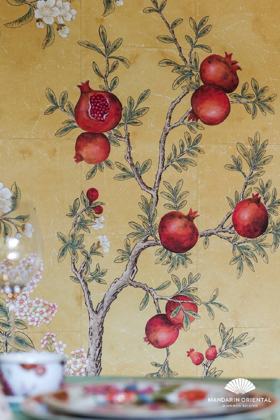 de Gournay将欧洲二十世纪中叶的家居装饰艺术美学带到北京前门文华东方酒店,在这片承载着深厚历史记忆的四合院建筑群中,焕发别致的美学风格。步入枫香廊,首先映入眼帘的便是由de Gournay为此次合作特别创作的 “Qianmen Garden” 手绘壁纸设计。壁纸画面以酒店庭院的自然绿植为灵感,将出现在客房庭院内的玉兰、石榴、紫薇等植物元素与灵动的飞鸟巧妙融合,营造出充满诗意的自然画卷。巧妙呼应中世纪风格对几何秩序与色块对比的精髓,我们将壁纸装裱成屏风形式大面积展现细腻的笔触及柔和的色彩,与空间内精心挑选的家具陈设相得益彰,共同构筑出一个富有色彩张力的场景。而在与前厅紧接的沙发休憩空间,则选用了de Gournay最新的手绘壁纸设计之一 “Pietra Dura” ,同样以屏风形式呈现的画面中,羽翼斑斓的鸟儿振翅欲飞,繁茂盛放的花束瓶中招展,静中有动,一派生机。