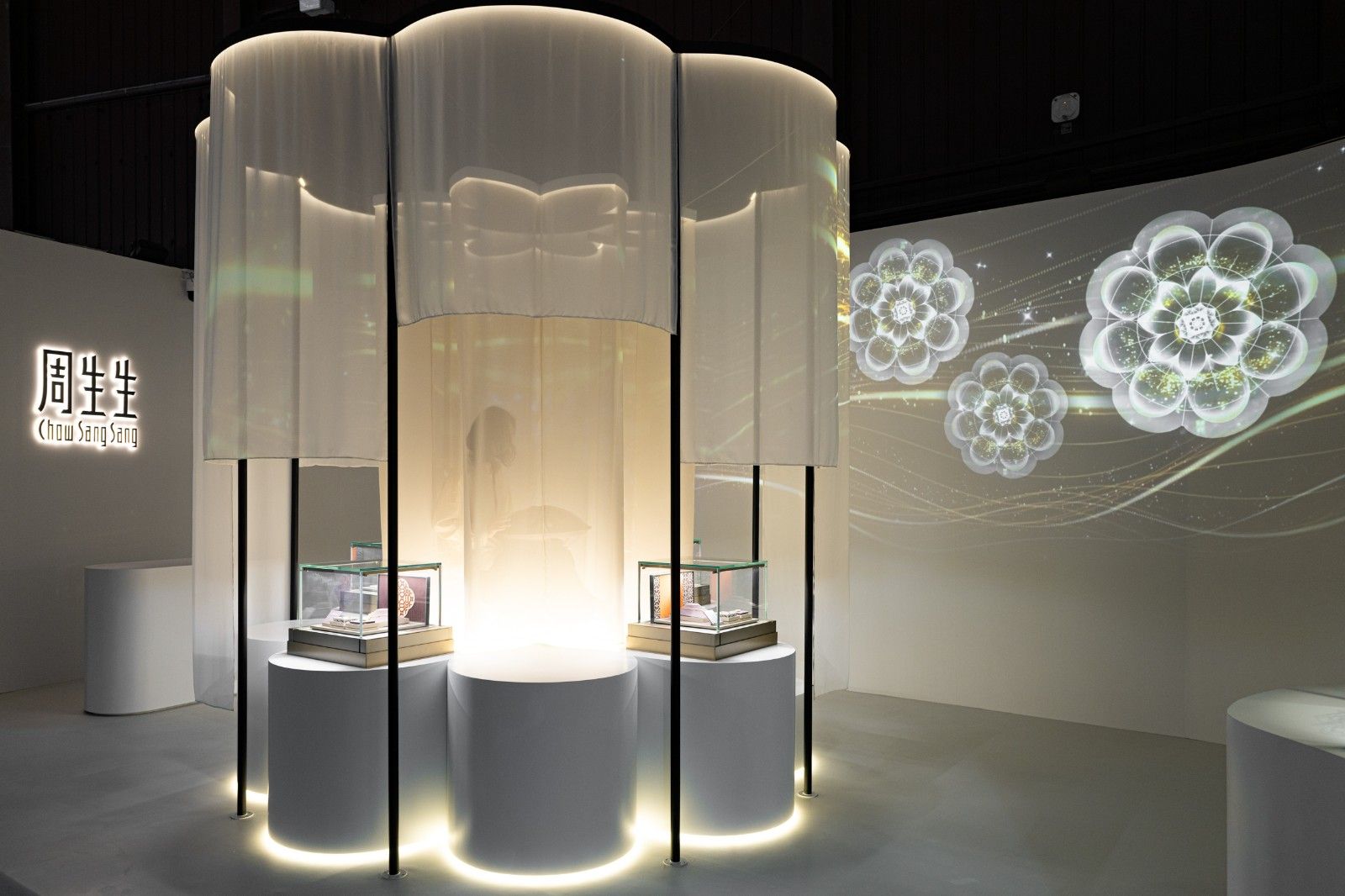 虚实交织的场域中,曼陀罗图腾从空间的流动意象凝练为触手可及的匠心之作,将无形的精神共鸣具象于珠宝的永恒之美。核心展区内,层层纱幔环绕多款文化祝福「东方古祖」曼陀罗新作,与足金葫芦钻石项链共同以古法工艺对话当代设计。