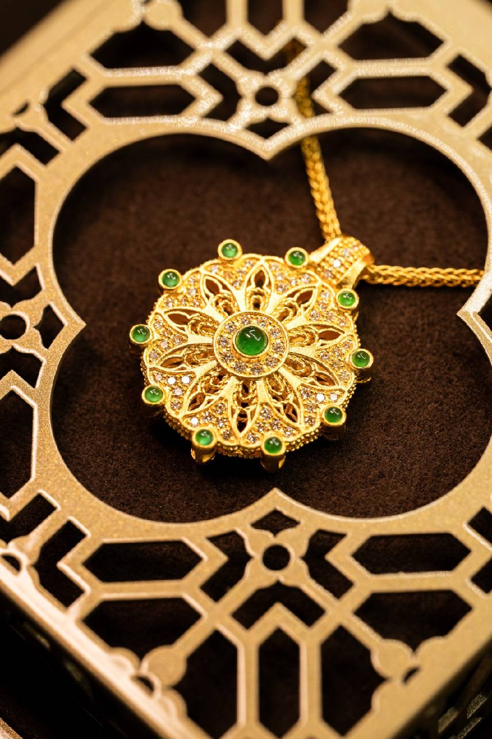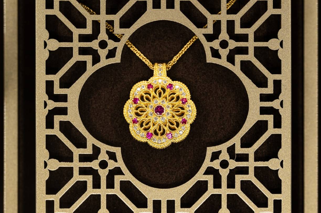 品牌凝聚古祖黄金的温润,将花丝镂空工艺雕琢曼陀罗图腾,打造出足金曼陀罗钻石项链。中心主石及环绕美钻化作花蕊,花瓣一致对称向外延展,并以几何线条重复建构,细腻呈现图案的对称平衡之形。每件作品皆是自然灵韵与人文哲思的结晶,以独特设计语言将隽永祝福具象为可佩戴的永恒之美。新作更甄选红宝石、翡翠点睛镶嵌,为繁复纹样增添尊贵及丰盈生命力,阐述着东方美学关于疗愈的解答。