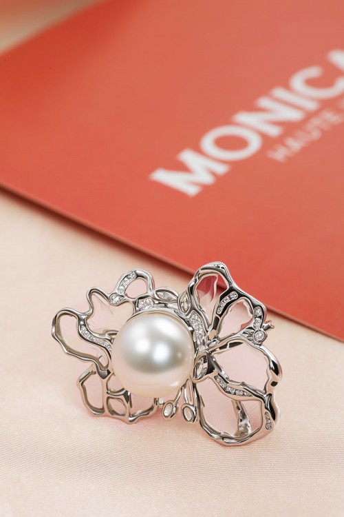 此次获奖的珍珠海岸系列胸针,是 MONICA YU 高级珠宝匠心精神的杰出代表。这枚 18K 金维纳斯级别澳白吊坠胸针两用款,灵感源自珍珠海岸的灵动之美,设计师以精湛技艺捕捉海水与泡沫的瞬间灵动,将其幻化为珠宝的永恒形态,恰似海浪轻抚沙滩,留下一串珍珠般的璀璨痕迹,尽显自然之美。从构思到成品,历经长达 3 个月的精心雕琢,设计图稿反复打磨,每一处细节都凝聚着匠人的专注与热忱。珠宝采用定制切割的白水晶,并运用先进的悬浮式镶嵌工艺,使水晶仿佛悬浮于空中,闪烁耀眼光芒,不仅极大提升了工艺难度,更增加了成本投入,凸显其珍贵价值。主石为一颗拥有日本真科研大证的维纳斯级别澳白珍珠,13.2mm 的圆润直径,光泽温润而明亮,品质臻于上乘。近年来,澳白维纳斯珍珠因稀缺性而价格不断攀升,被视为理想投资之选。此外,珠宝整体重达 17.85g,搭配 33 颗天然高白足反钻石与 5 颗白色蓝宝石,更添璀璨华彩。值得一提的是,其巧妙设计让胸针可与吊坠自由转换,为佩戴者带来更多风格可能,彰显实用性与艺术性兼具的高级珠宝理念,成品还配有全英文国际证书,品质与价值双重复证。