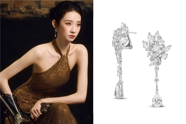 张艺凡耳畔佩戴BAUNAT宝欧娜高定珠宝系列花式切工钻石耳钉。这件簇状耳环作品由马眼形、梨形、公主方形与圆形切工钻石交织而成,点缀满镶钻石缎带,整体造型如星瀑垂落,光芒凝练。各种切工的钻石层叠组合,结构张力十足,如同光影凝结成的雕塑。缎带式满镶钻石在耳侧垂坠,在步履间闪现锐利光芒,形成极具动感的视觉焦点。它所传递的不只是华美,更是一种释放边界的姿态——如张艺凡此刻般,不再被定义,敢于突破,用最直接的方式表达自我。来自安特卫普的钻光凝结成张艺凡“破茧”时刻中最闪耀的注脚。