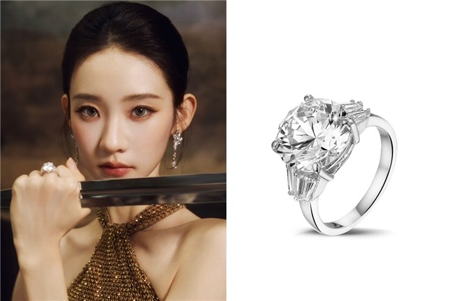 而她指间佩戴的BAUNAT宝欧娜高定珠宝——三钻白金圆钻戒指,则为整套造型增添了内敛而深刻的力量注脚。中央主钻璀璨耀眼,两侧尖阶梯形钻石利落挺拔,仿佛象征张艺凡内心的坚定与清醒,在温柔表象之下,藏着不容忽视的锋芒。这枚戒指不仅仅是珠宝,更像是一种态度的呈现,映照她在演艺道路上破局而出的坚毅神情。
