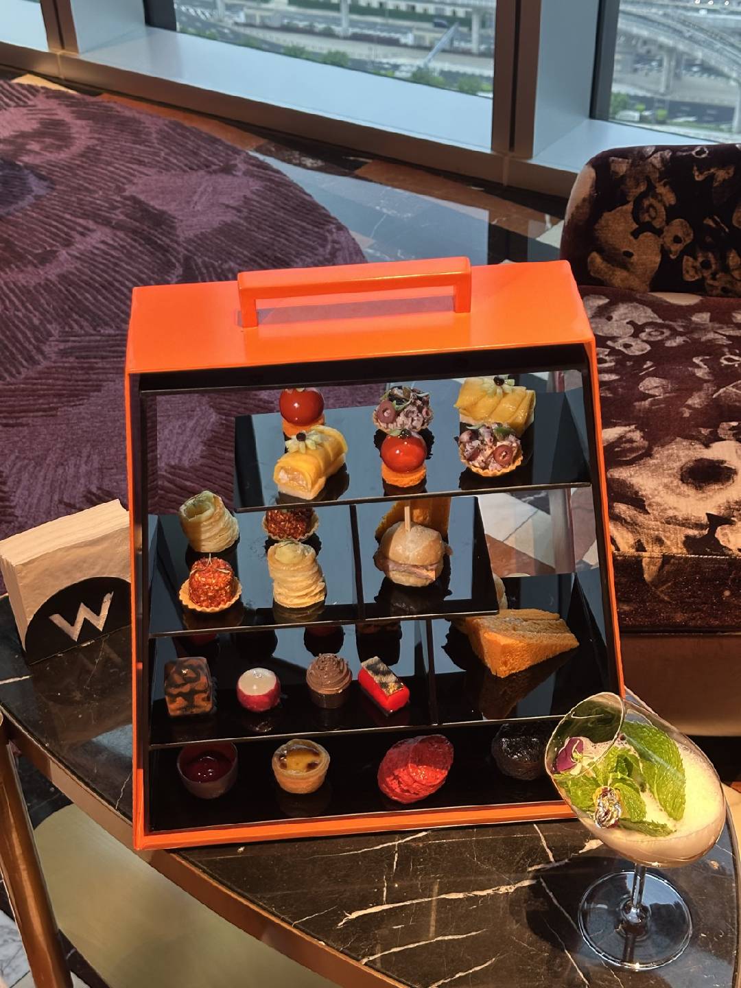 午后,不妨移步至来到40楼的Blind Tiger,开启云端下午茶之旅,将视野展开至整个路氹景致,让澳门的城市纹理与盘中点心同框。“虎藏拾味”系列下午茶以现代美学重新组织葡澳风味,鹅肝洛神花啫喱、迷你猪扒包与竹炭黑芝麻松饼整齐排列在红黑双色多层食盒中,搭配果香调制的“琥珀虎曦”无酒精鸡尾酒,氛围轻松惬意。
