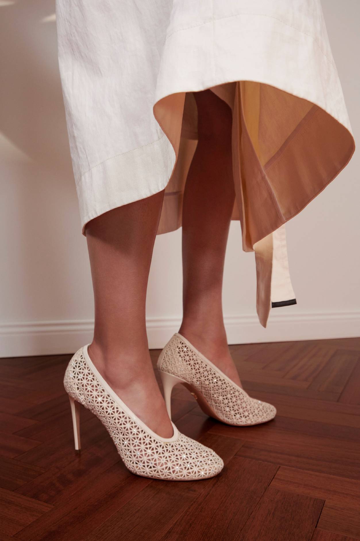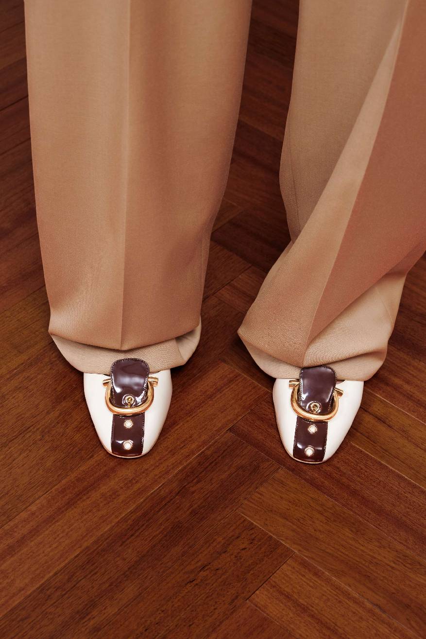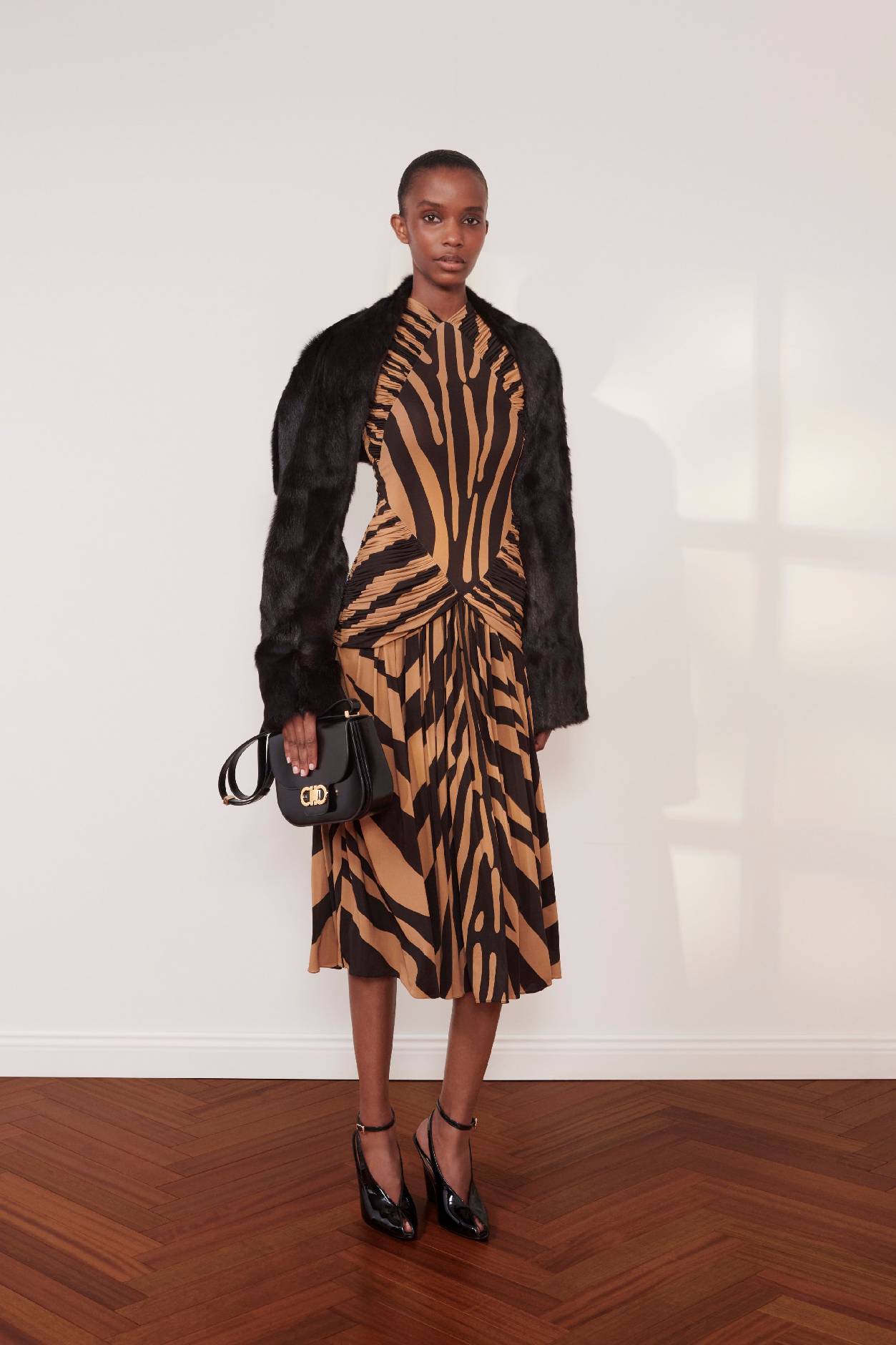 鞋履方面,新款高跟鞋的编织鞋身源自1930年代Salvatore先生所创鞋履的鞋带,搭配形如香烟的细高跟;1968年的扣饰高跟鞋则以新颖视角重释,配以对比感皮革与Gancini细节。全新尖头短靴由黑色漆皮搭配斑马印花马毛材质制成;鳗鱼皮乐福鞋和楔形穆勒平底拖鞋闪耀金色光芒。此外,典雅圆头凉鞋着染标志性菲拉格慕红。Davis沉思后说道:“我认为每件作品都别具意义,这正是Salvatore先生自创立之初秉持的理念。每双鞋履皆有其用途,无论是用于Marilyn Monroe的表演,还是Georgia O’Keefe的日常生活。”
