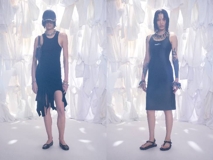 以空气层面料替代皮革,质感光滑,图形感强烈,为背心裙和拼接长裤增添了分量感的同时,也呼应着运动美学准则。这种高低混搭的平衡贯穿始终:水洗棉布、慵懒套装和日晒褪色叠层,与挺括丹宁和奢华皮革并置。