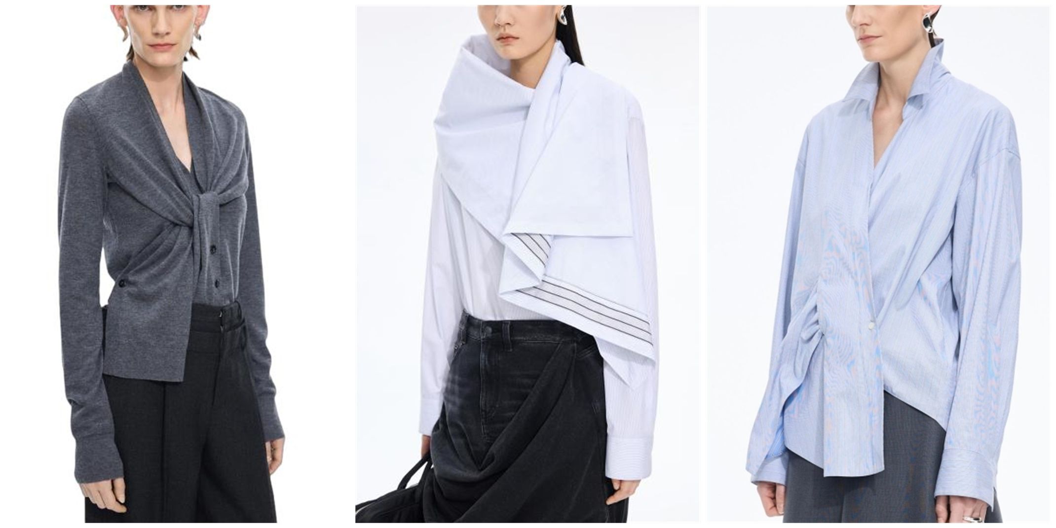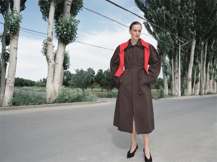 经典精梳棉外套,布面紧密挺括有骨感,纹理在光线折射下呈现清晰的肌理层次,不刻意收腰,下摆自然垂落打破日常着装的局促感。亦或天空蓝不规则片状领口衬衫,飒爽剪影里藏着随性态度,两种状态自如切换。在生活的舞台上成为不同 “角色”,完美实践“将生活变成舞台”的理念,展现都市女性的多面、丰富、矛盾的瞬间,每一面都是独特的自我。