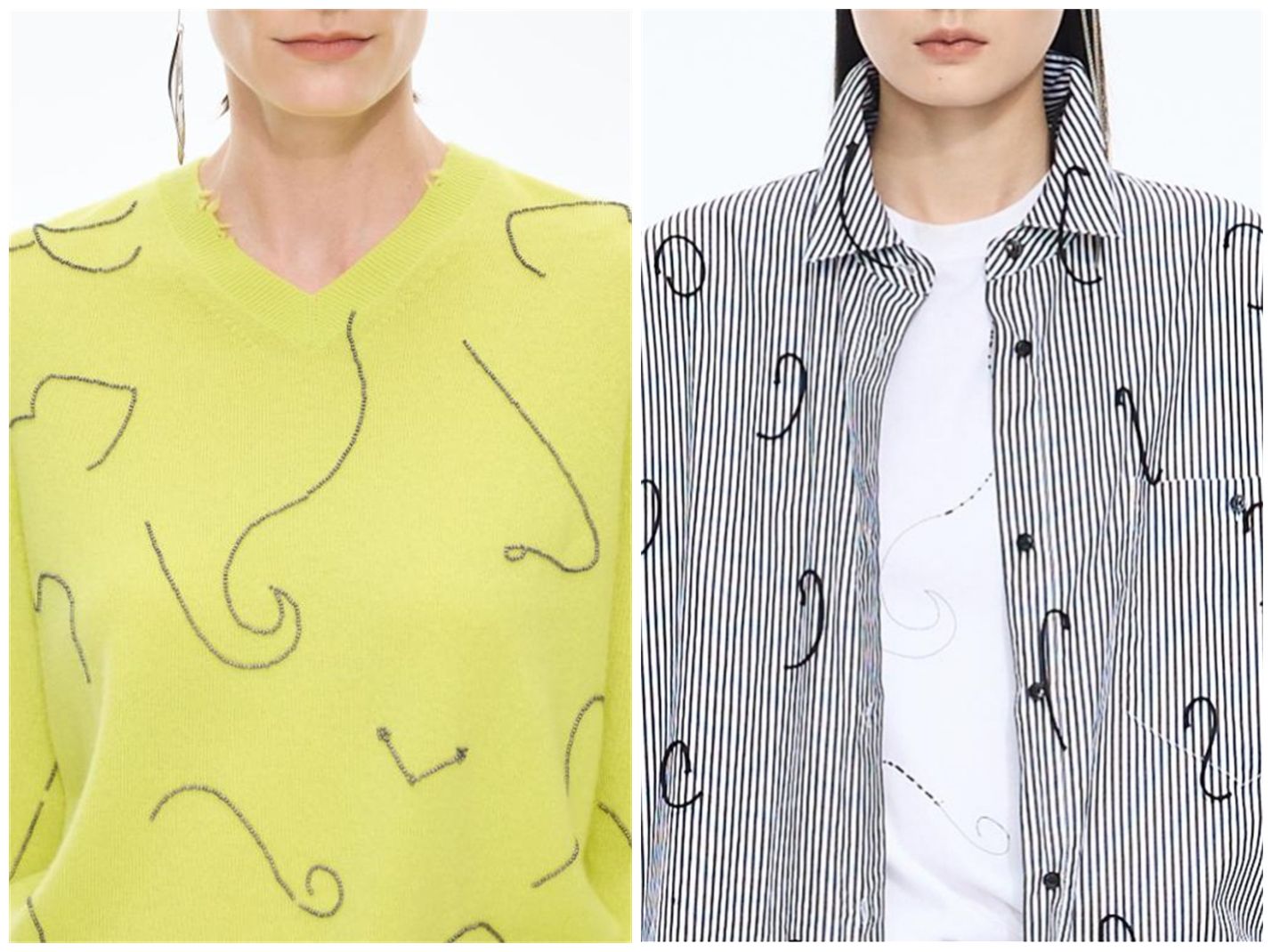 漫画感的线条转换成荧光黄羊绒衫的异形珠管的手工刺绣,在柔软的面料上构筑立体耀斑,演绎出“聚多为一的群体孤影”。多种珠片组合重工缝制,坚硬质感碰撞轻柔材质,隐喻现代女性的柔韧锋芒。这季新加入了弯钩流苏的工艺,流苏选用独特的横机材质,以倒挂的姿态立体嵌入衣身当中,随着步伐轻轻晃动,呈现轻盈,优雅且俏皮的气质。当漫画碎片与珠片光斑、弯钩流苏共舞,穿梭于身上,成为行走的城市叙事诗,极富有故事性和氛围感。