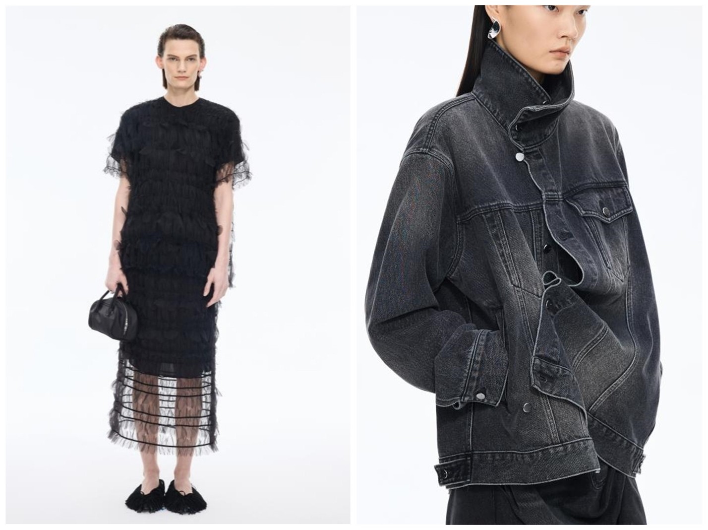 压褶工艺成为个体与面料的一次对话,手工捏制出捏褶、交叉褶、重叠褶的独特痕迹,赋予垂坠的流动美学。当薄透网纱在压褶中凝成呼吸层次,跳动细褶则结合网纱面料的薄透,让光线穿行间营造微妙光影美感,兼具优雅与韵味。透纱T恤交搭配半裙慵懒生姿,脚踏流苏单鞋踏过城市节拍,传达轻松自在的松弛感。进口粗斜全棉牛仔外套,经典H型剪裁,OVERSIZE不对称立领,增添个性,轻松打造摩登街头风,衣橱里必备时髦单品。