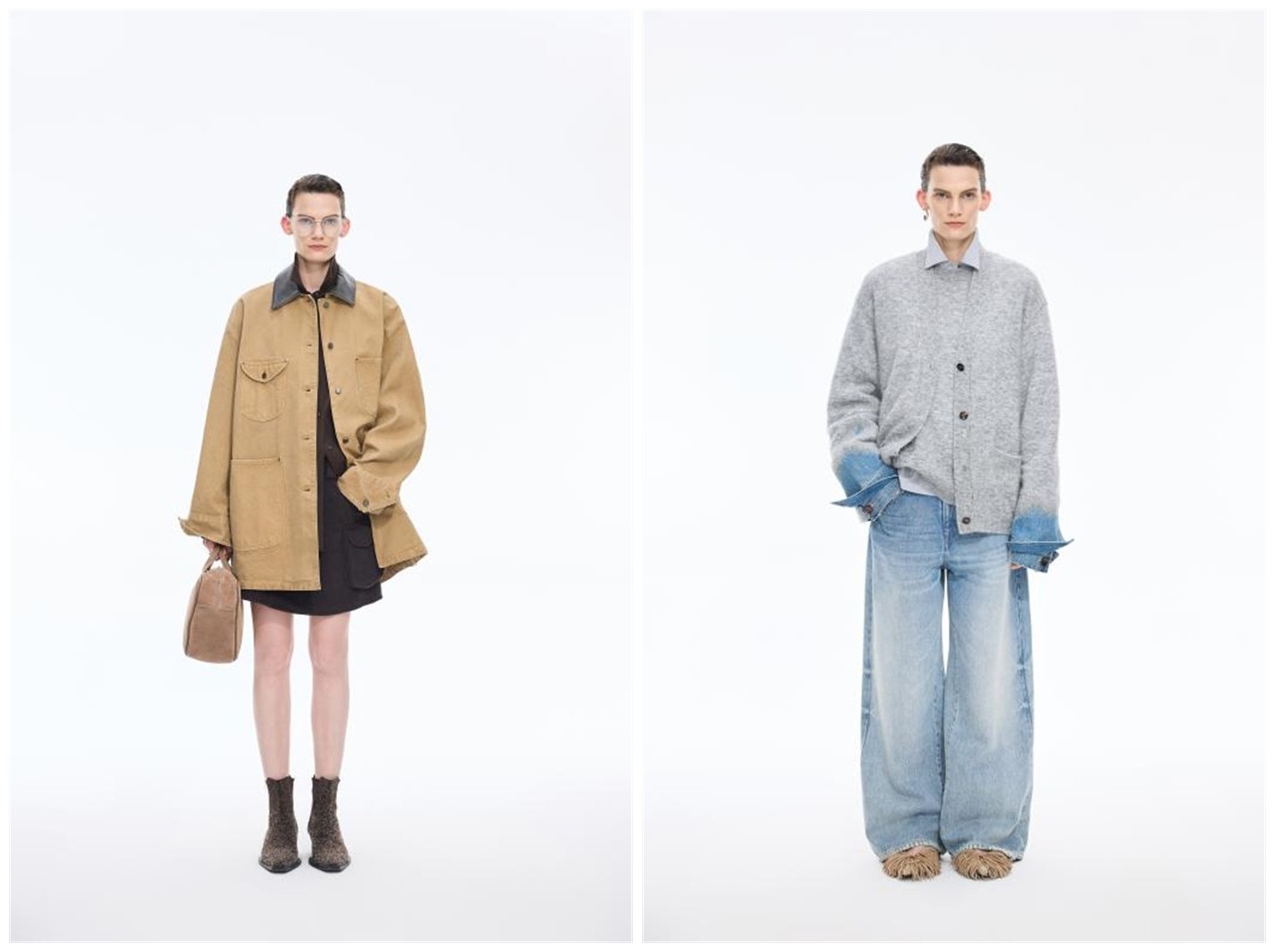 厚实的灯芯绒承载秋冬温度,皮质以利落线条勾勒轮廓,两种材质拼接共生。马海毛面料的柔软绒感,与牛仔面料袖口的硬朗形成反差。不同面料的拼叠、材质的碰撞,以明亮色块的点睛。质感毛呢、个性牛仔与细条纹肌理布碰撞,挺括与垂坠、纯色与纹样交织,似把多元灵魂碎片聚合,每一块面料都保留独特个性,又共同创造出新的故事。