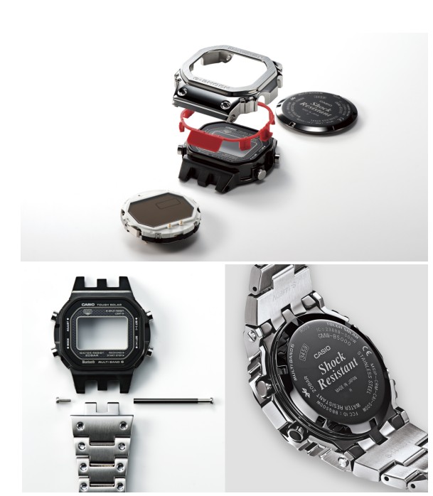 两款新作的不锈钢表圈经镜面切割与拉丝交错处理,顶面泛着冷冽银光,斜面则倒映出80年代工业美学的棱角。而且,为延续G-SHOCK的防震灵魂,日本山形工厂在两款腕表的金属表圈与内壳间嵌入精密树脂缓冲层,三齿型凸耳结构将冲击力分散传导,使金属腕表也同样能承受外部冲击的严苛考验。并且,工匠团队还为表壳装配螺旋密封底盖,通过200米水压测试,确保初代防水哲学在金属时代历久弥新。
