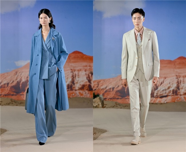 色彩哲学上,深井蓝与可可奶油色的碰撞,精准呼应Pantone 2025年度色“摩卡慕斯”趋势。“都市牧歌”系列以双色交织现代精英气质,挺括西装邂逅自然褶皱,功能细节暗藏匠心;“牧野漫步”系列则以苔藓绿与秋枫橙晕染旷野生命力,科技面料加持轻旅设计,步履间尽显松弛与力量的平衡。这场大秀不仅是服饰革新,更是一场关于自由与克制的美学宣言。
