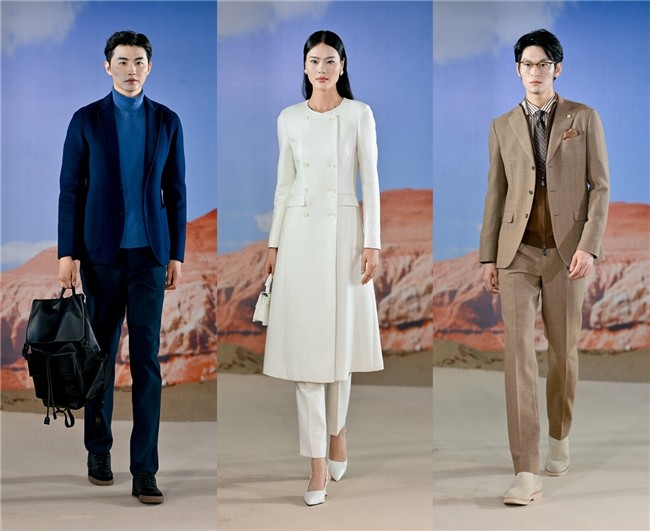 模特游走于城野边界,以流动的时尚语言演绎“品智生活、多元场景、自由哲学”三大主张。本季设计将山川的静穆与川流的动态凝于针线,大地色系沉淀时光,利落剪裁回归本真。挺阔西装象征都市秩序,而流动的天然肌理则暗藏自然韵律,在商务与旷野间探寻诗意栖居。当“情绪消费”成为品质生活的关键,隆庆祥以当代优雅回应都市文明与自由向往的永恒对话。