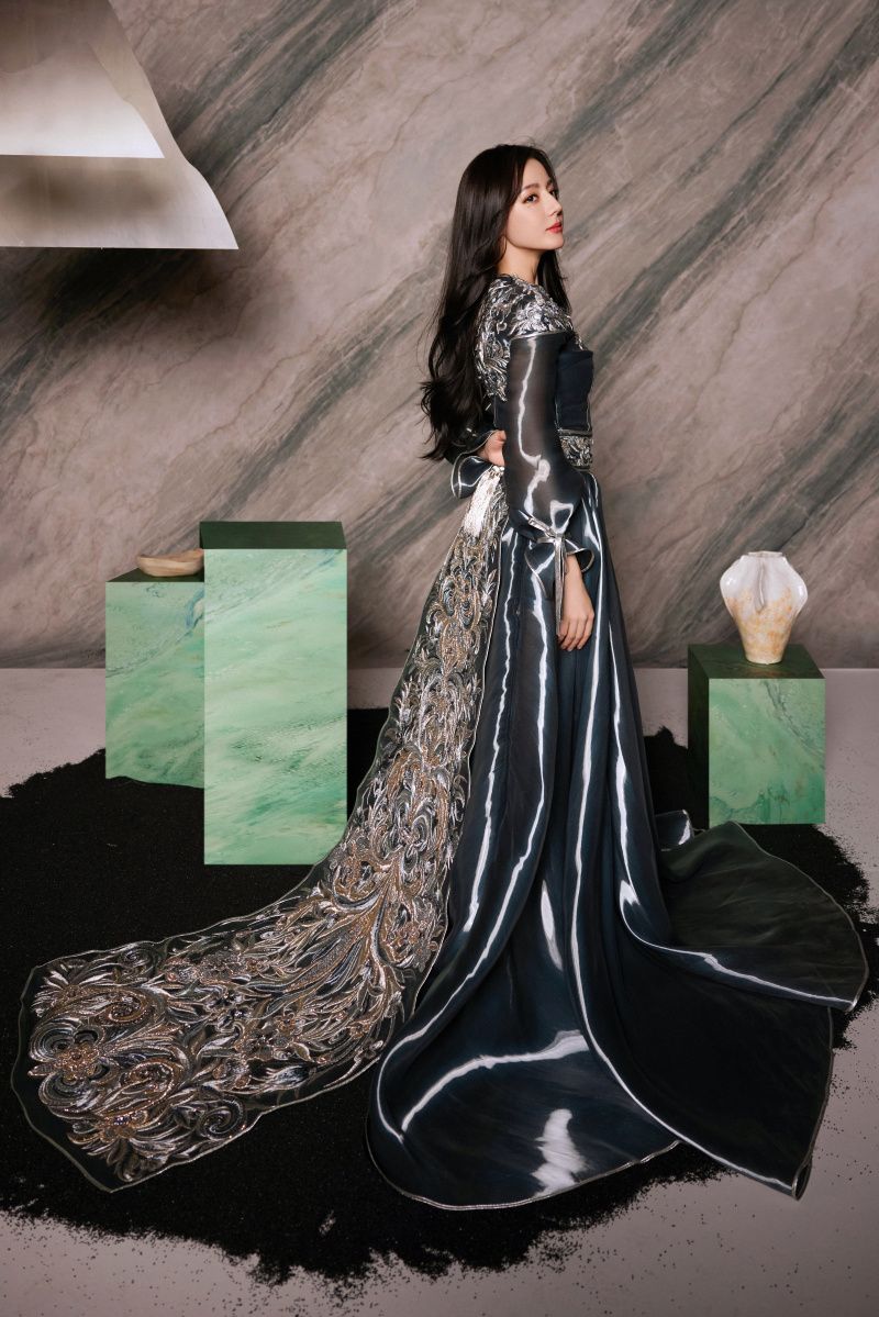 这次解锁全新身份,迪丽热巴再次身着她与冠珠瓷砖的老朋友——高级定制服装设计师、“中国高定第一人”郭培的两件作品,两套高定礼服裙皆是以融合手法表现东方主题。银色缎面的流光裙来自于郭培2016春夏的高级定制系列,以西方宫廷式样、卷草纹与大量花朵图案来衬托不同姿态的传统东方技法刺绣的凤凰图案,用西式宫廷纹样的厚重端庄来凸显“凤凰于飞”的华贵典雅。