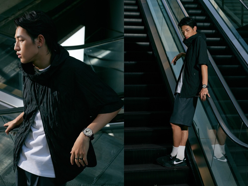 GBM-2100A-8B的淡香槟金色从都市的精致感中挣脱,迸发出ESTP探险家型人格 的冒险精神。表盘如同被晨光亲吻的山岩,而黑色时标则带来硬朗的户外气息,使之成为 山系风格的灵魂搭档。身穿黑色冲锋衣内搭速干透气T恤,下身搭配耐磨防泼水的工装裤, 解锁介于都市与山林之间的穿搭灵感。