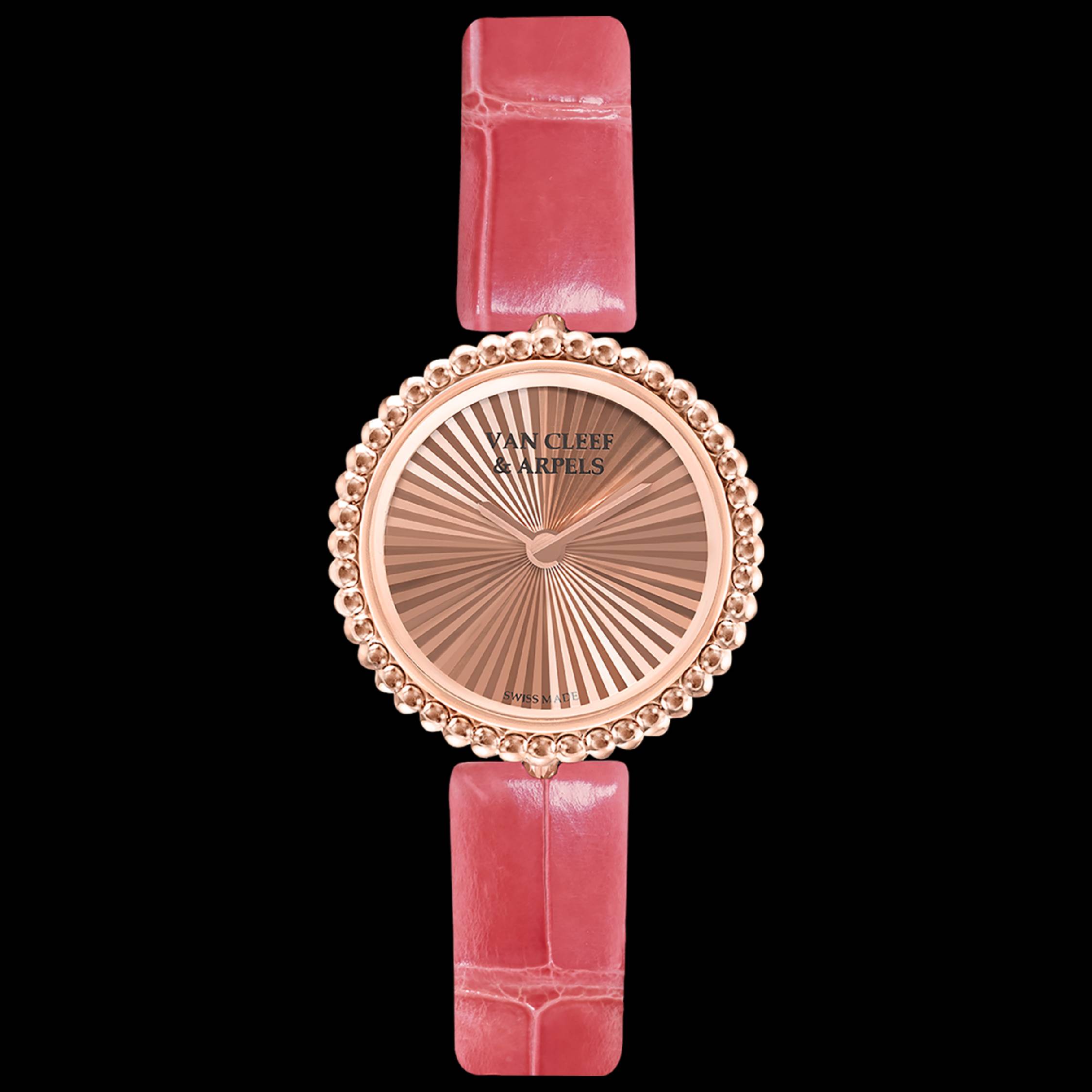 Perlée腕表以玫瑰金映衬钻石的澄澈华彩,圆润金珠簇拥着柔美圆形表壳,宛若繁星环抱明月,为腕间镶上一圈轻盈而璀璨的光晕。Perlée隐秘式吊坠腕表,以诗意手法细诉韶光奥秘,轻转密镶美钻的表盖,表盘徐徐映现,缓缓诉说每一段与挚爱相伴的美好时光。