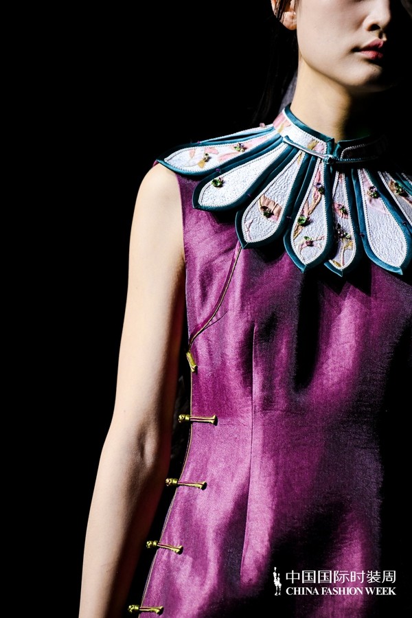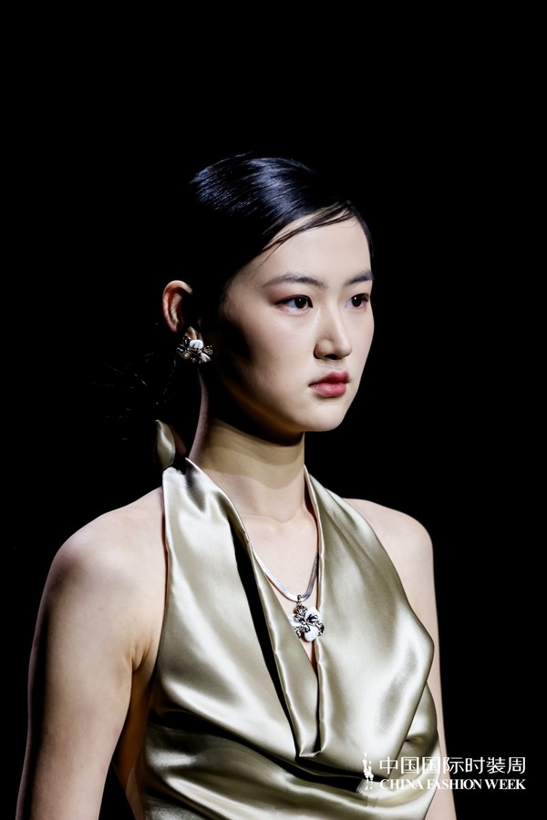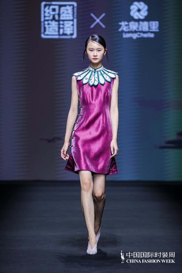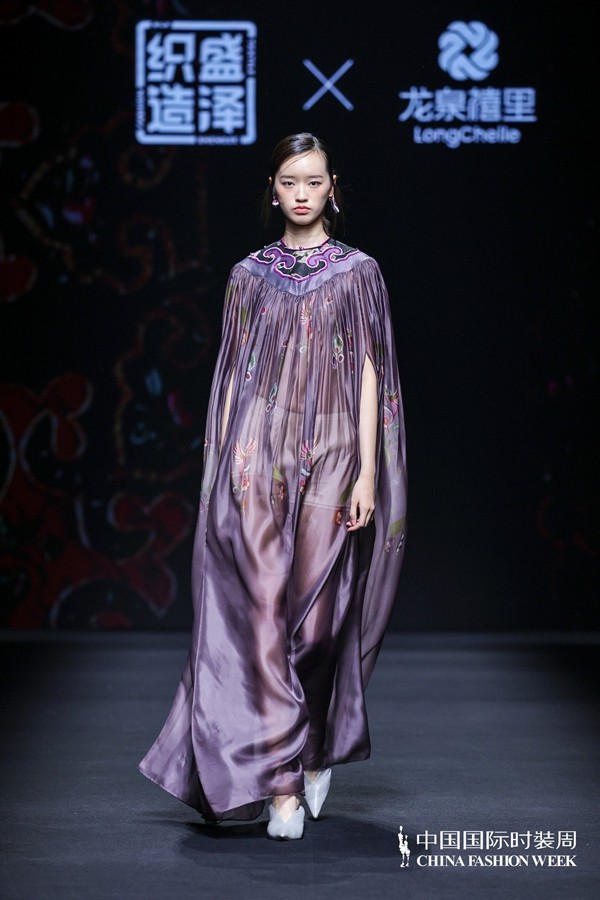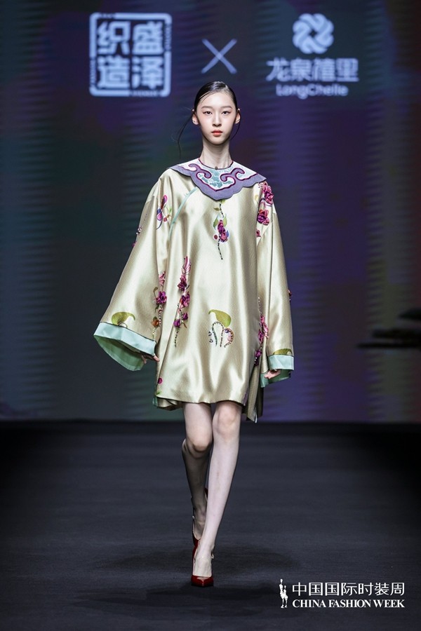 “循意”主题由龙泉禧里协办演绎。系列取意于传统云肩的东方纹样,将其优雅弧度与吉祥寓意化为当代设计的灵感源泉。织锦与丝毛的厚重质感交织轻盈欧根纱,形成虚与实、刚与柔的层次对话。刺绣、绲边、镶嵌与镂雕等手工技艺被巧妙嵌入,在细节处散发东方手作的温润气息。