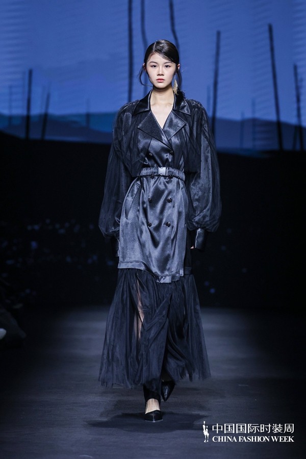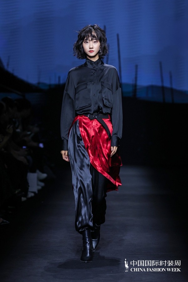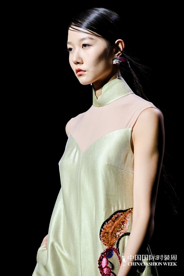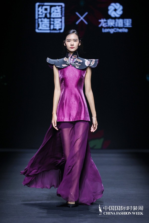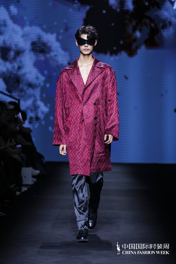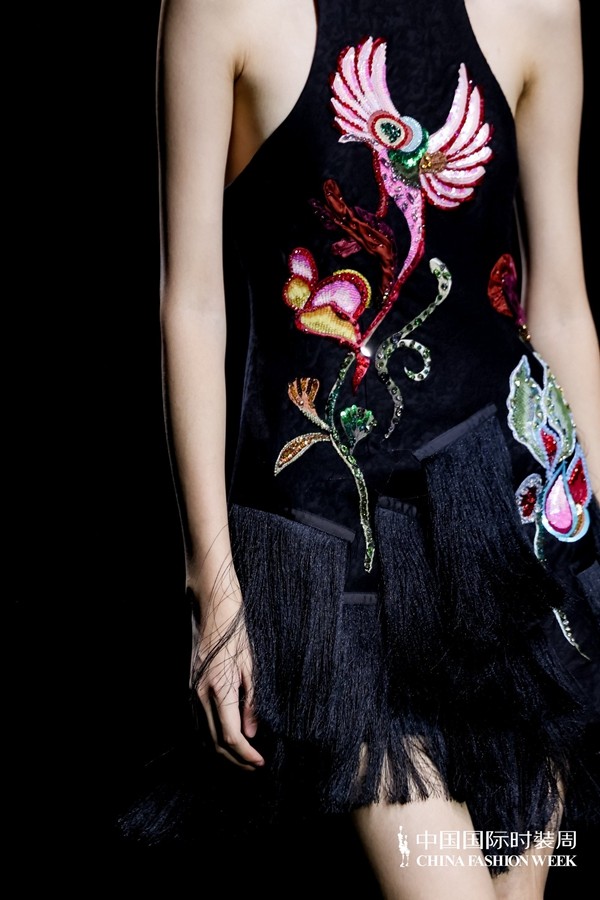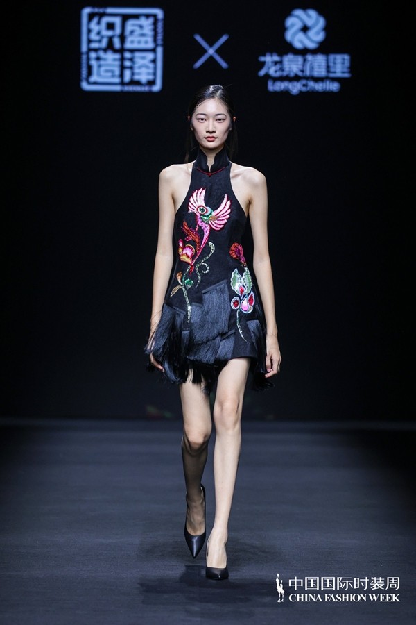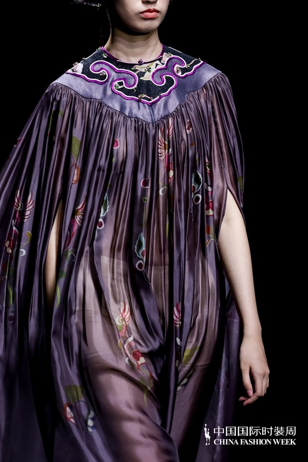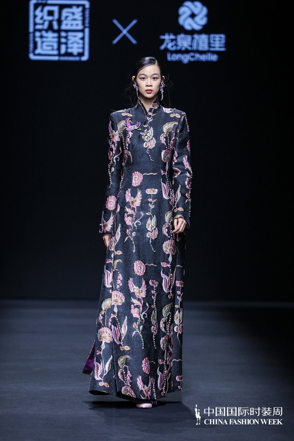 色彩与纹样源自古典艺术意象,在黑、金、紫红的沉稳基调中,透出精致的花卉与卷草纹理,仿佛让古老文脉于T台之上重获新生。廓形设计张弛有度,既有流苏鱼尾裙与旗袍勾勒的东方典雅,也有不对称拼接与夸张肩线营造的摩登张力。整场秀宛如一场时空交织的仪式,将东方之美与现代时尚融汇为一首关于传承与革新的乐章,生动诠释了“循意”的深意。