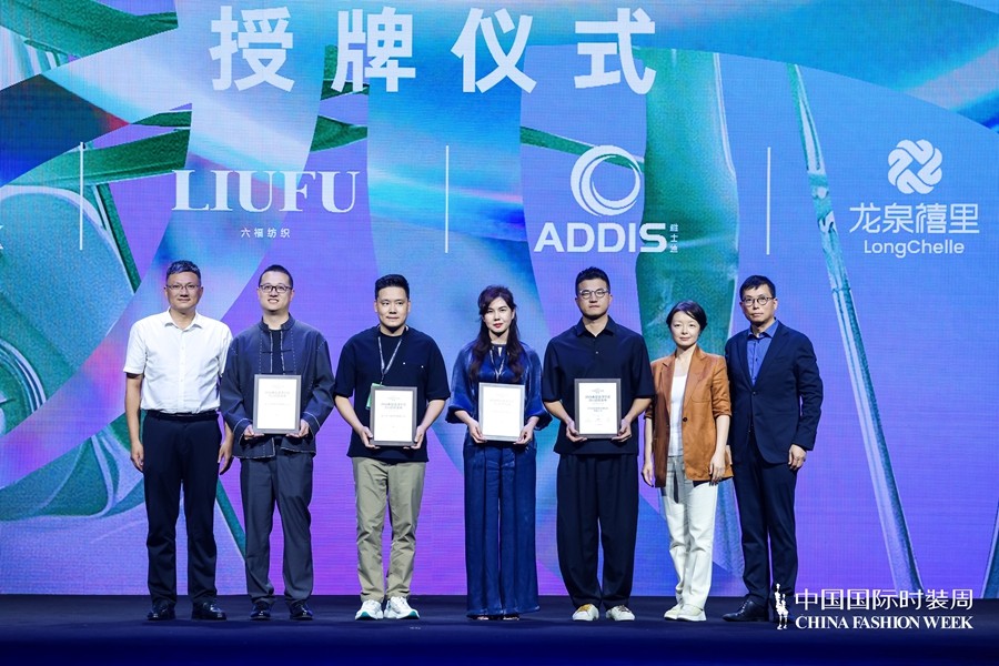 紧随启动仪式,活动进入授牌环节。在各位领导与嘉宾的共同见证下,由张玮、谢方明、王君,分别为源泉丝绸、六福纺织、雅士迪和龙泉禧里四家本土实力面料企业授予“盛泽织造流行趋势发布合作伙伴”的荣誉称号。这一授牌不仅是对企业长期深耕面料研发与原创设计的高度肯定,更彰显了盛泽在区域品牌与企业品牌协同发展中的坚定步伐。作为盛泽面料产业链的中坚力量,这四家企业在趋势引领、工艺创新、时尚转化等方面展现出卓越实力。它们的携手参与,不仅为“盛泽织造”注入更多元的创意表达和产业活力,也进一步凸显了盛泽作为国内重要面料高地、国际时尚策源地的引领地位。