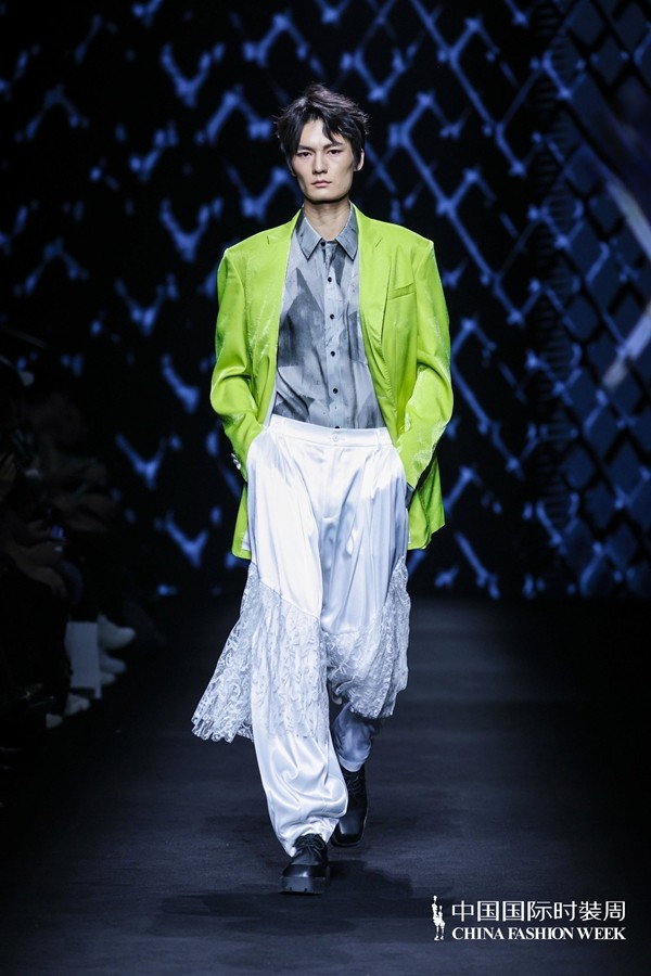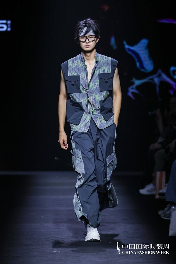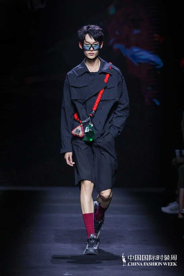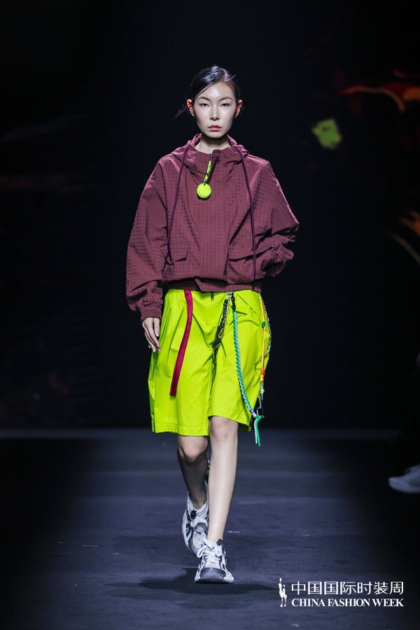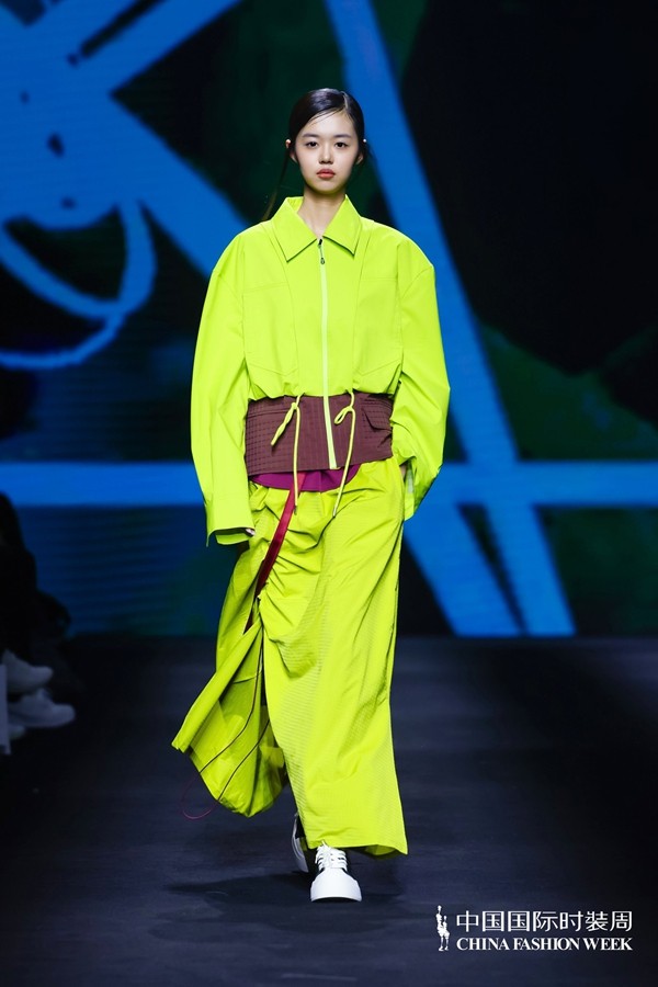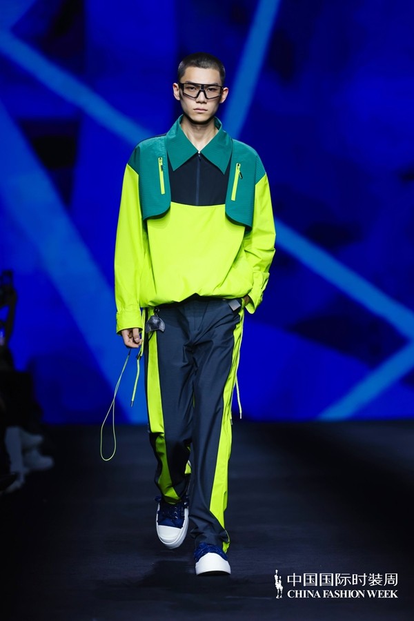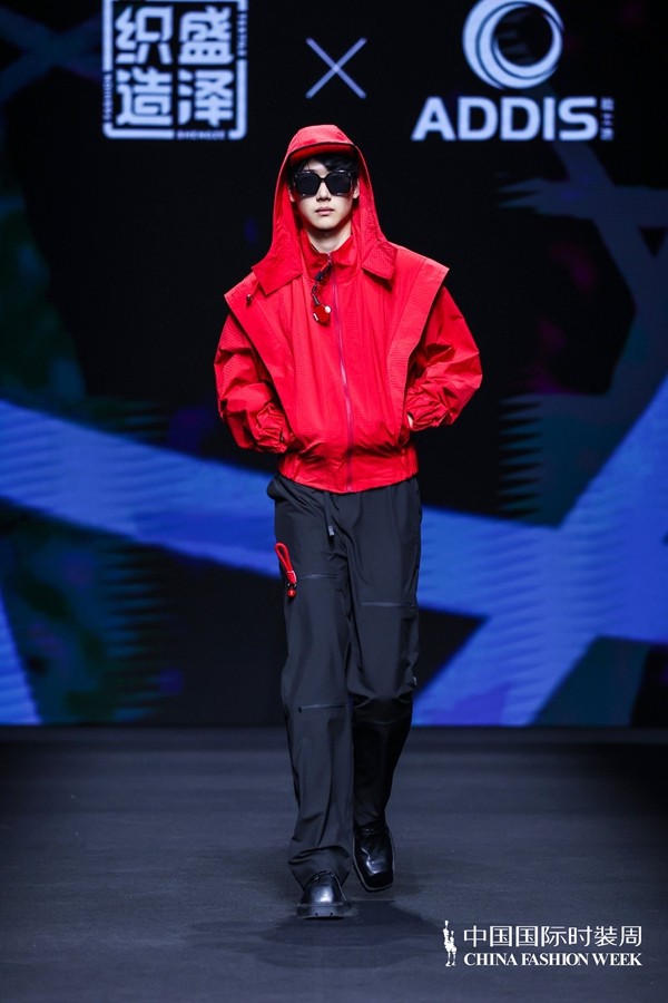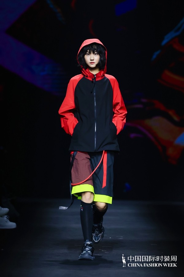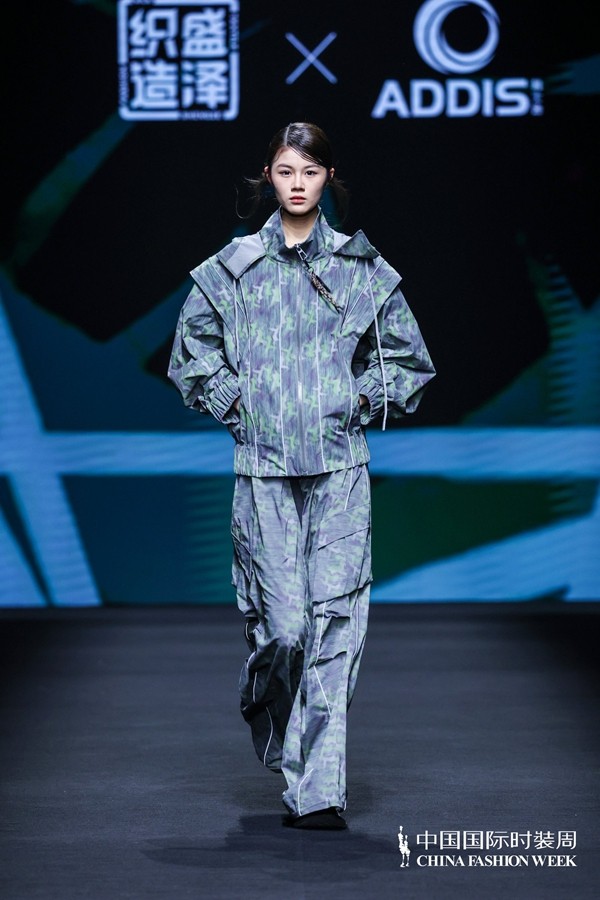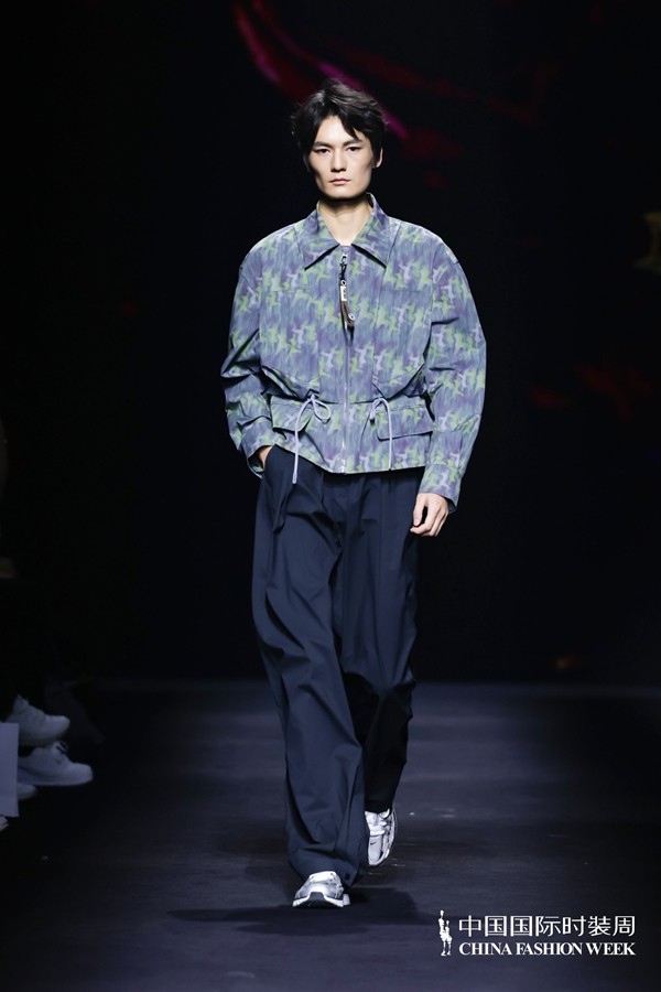 “交响”系列由江苏雅士迪集团有限公司协办呈现。系列聚焦都市运动风尚,以功能性户外面料融汇简洁廓形,展现自在灵动的生活态度。轻盈尼龙与科技面料在拼接与印花中释放张力,既兼顾舒适防护,又赋予造型鲜明的时尚气质。