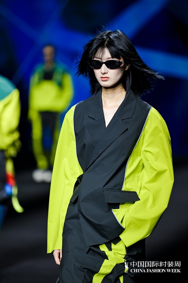 黑、白、灰的冷静基调间,跳跃的黄、绿、红与橙点燃舞台,营造充满节奏感的视觉冲击。几何图案与反光元素强化了运动感与未来感,让动感与精致在同一画面中交织。整体系列以都市为背景、以运动为语言,构筑出自由、活力、前瞻的时尚景观,生动诠释了“交响”的主题内涵。