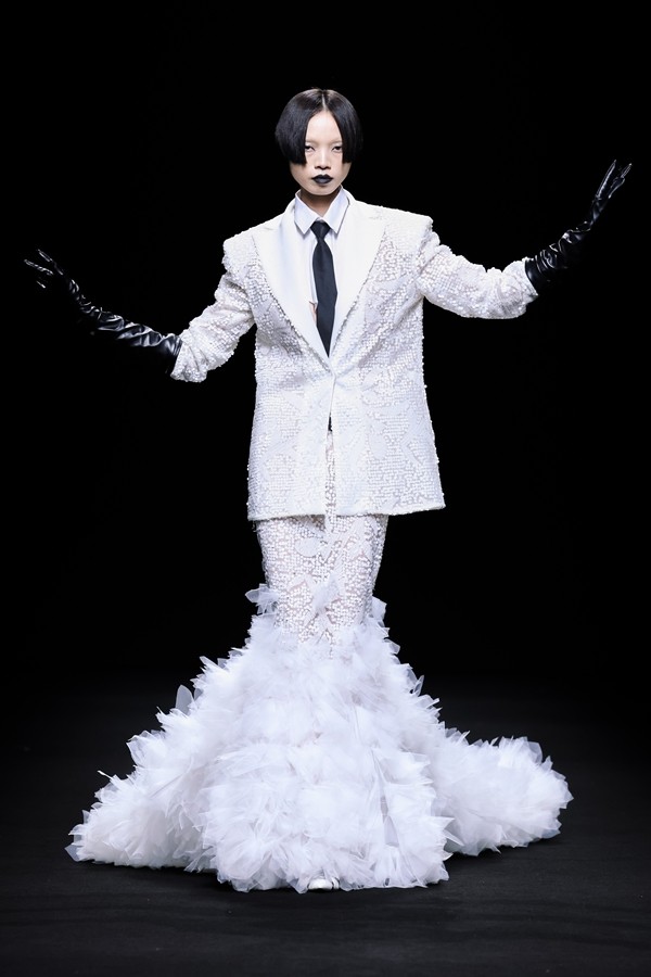 剪裁上巧妙融合神话生物的形态特征:不对称层叠裙摆似汹涌浪涛,缀满珍珠与金属鳞片的紧身胸衣勾勒出身体曲线,拖尾设计则如海妖舒展的尾鳍,赋予穿着者灵动而充满张力的姿态。整个系列既保留了礼服的优雅华贵,又通过夸张廓形与奇幻元素,打破现实与传说的界限,塑造出宛如从神话中走出的深海精灵形象。