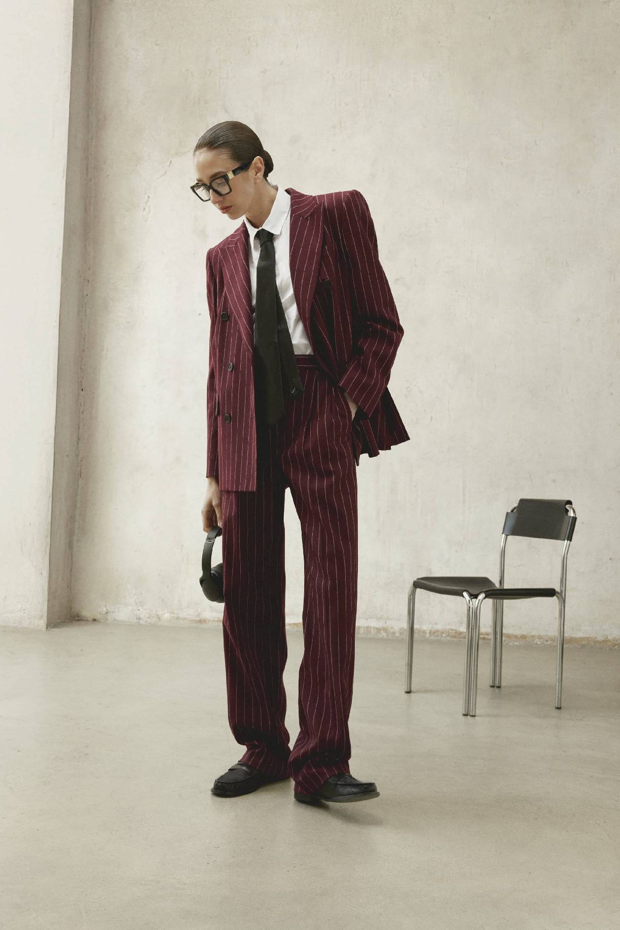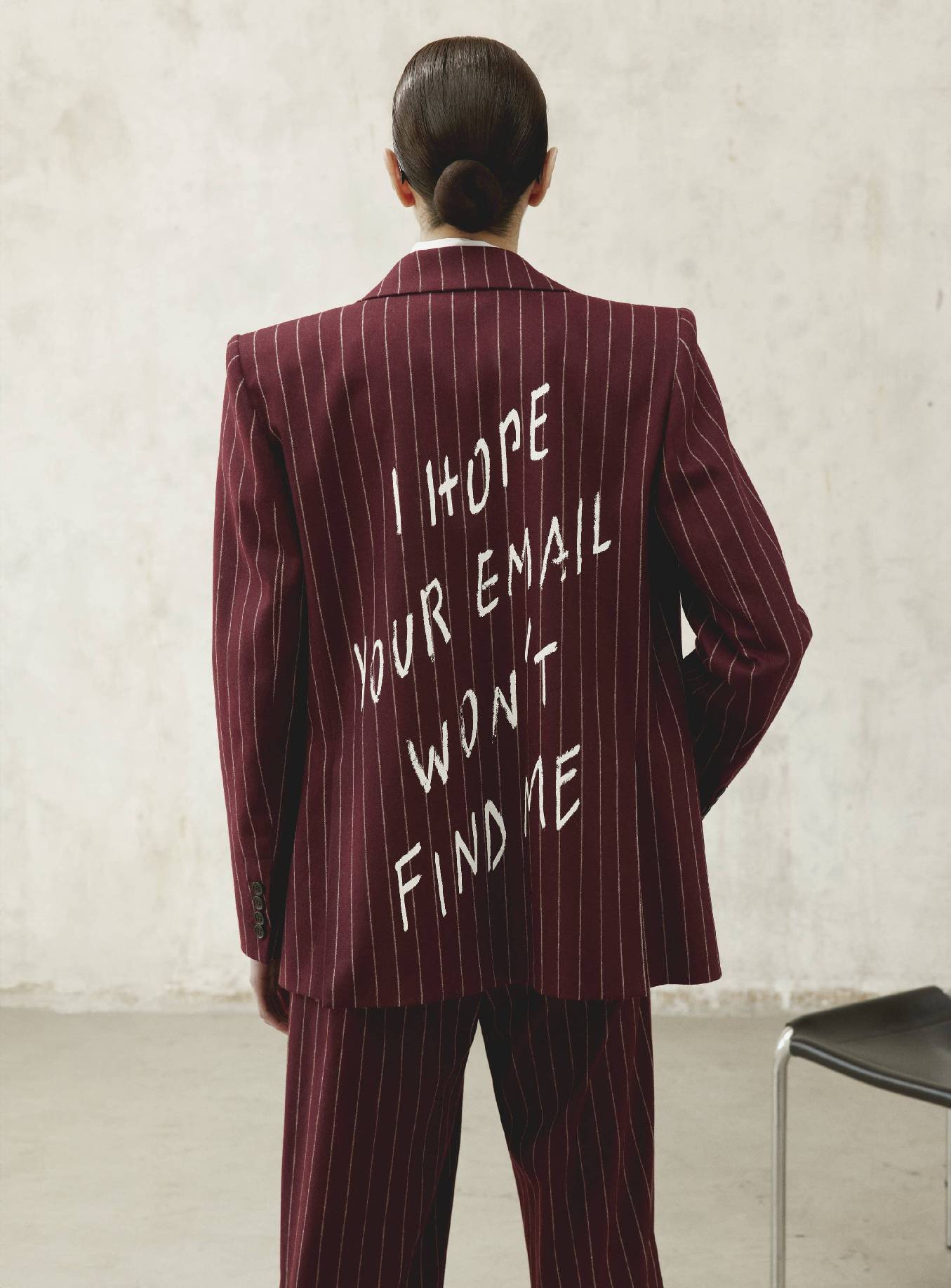 Terzini再次打造吸睛语录(如“I WAS RIGHT (我就说嘛)”、“HEARTBREAKER (心碎收割机)”、“SO FAR SO GOOD (目前尽在掌握中)”),这些“可穿戴的梗”出其不意地与服装本身巧妙呼应。纽扣衬衫背面印有“I DIDN’T STUDY AT OXFORD (不是学霸)”,而格子衬衫上则印有俏皮的双关语“I’LL CHECK AND LET YOU KNOW (‘格’外留意,查后回复)”。毛衣和T恤印有“GOOD VIBES, OR GOOD BYES (处得来就处,处不来就溜)”;连帽衫上则直白地写着“I’D RATHER STAY HOME(不如在家)”。这种戏谑精神也延续到了工装设计中,Terzini 从《教父》和《疤面煞星》等在意大利背景下的经典电影中汲取灵感,重新诠释了意式细条纹西装。宽肩版型的西装上印有幽默标语“I HOPE YOUR EMAIL WON’T FIND ME(别给我发邮件)”和“I NEED A DRINK (我需要喝一杯)”。
