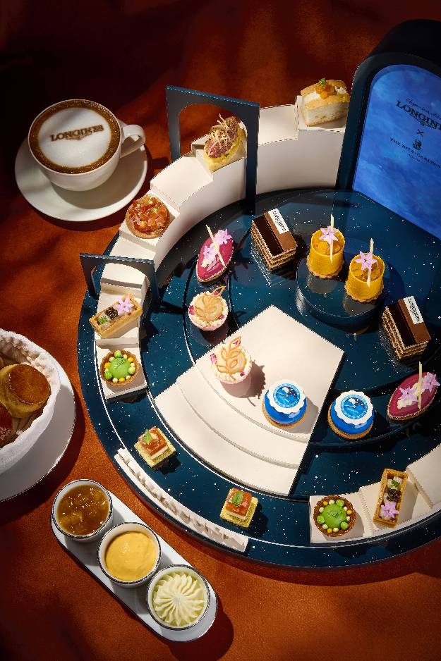 下午茶菜单由酒店厨艺团队匠心设计,以浪琴心月系列星辰腕表的设计元素为灵感,将时间流转、月相更迭与璀璨星光转化为可品尝的味觉体验。开场三明治轻盈适口,蟹肉与桃子的清甜巧妙融合,带来清新层次;香葱牛肉火腿开放式三明治风味醇厚,咸香从容。柑橘腌制三文鱼点缀柚子与奶油芝士,入口清爽,余韵悠长。粉草莓玫瑰酒酿冻似月下胭脂,无花果紫米慕斯东方食材细腻转化,口感温润而含蓄。