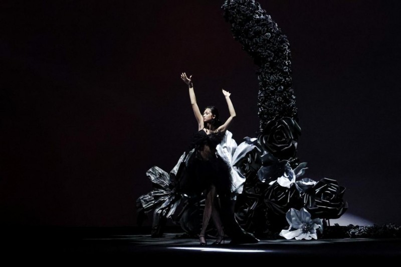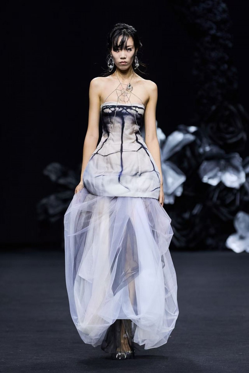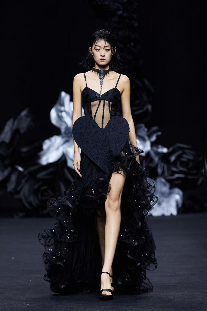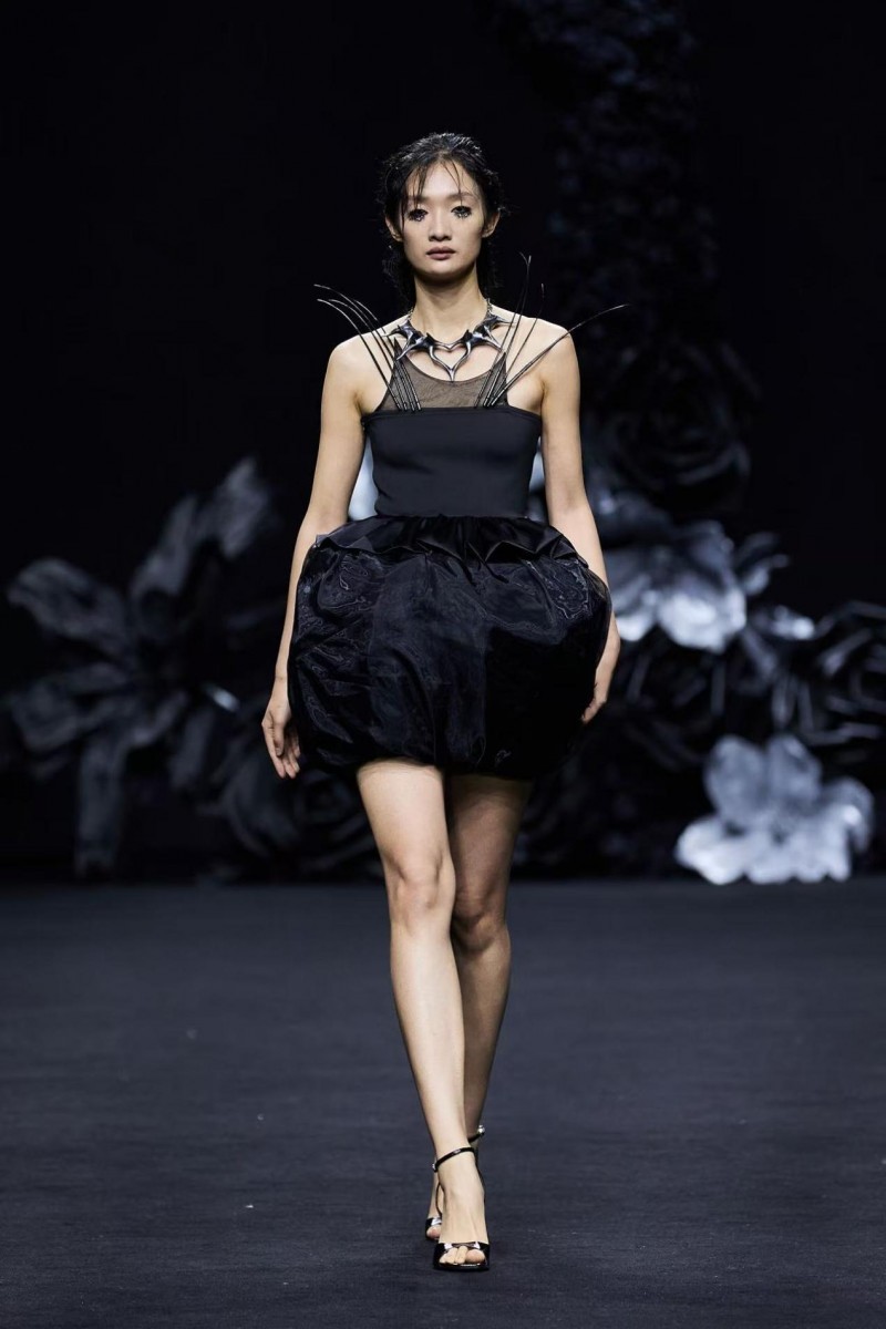材质上的运用别出心裁,黑色哑光皮革的冷峻、醋酸缎面的流光与闪光网纱的朦胧相互交织,构建出黑暗中潜藏的生命力;黑白花朵与藤蔓的几何纹理以印花形式呈现在缎面与薄纱之上,将凋零与盛放的瞬间同时凝固,具象化“向死而生”的悖论之美。剪裁上的突破性设计则成为视觉焦点,通过结构创新隐喻冲破束缚、迎光而生的精神力量,与品牌一贯的个性表达一脉相承。