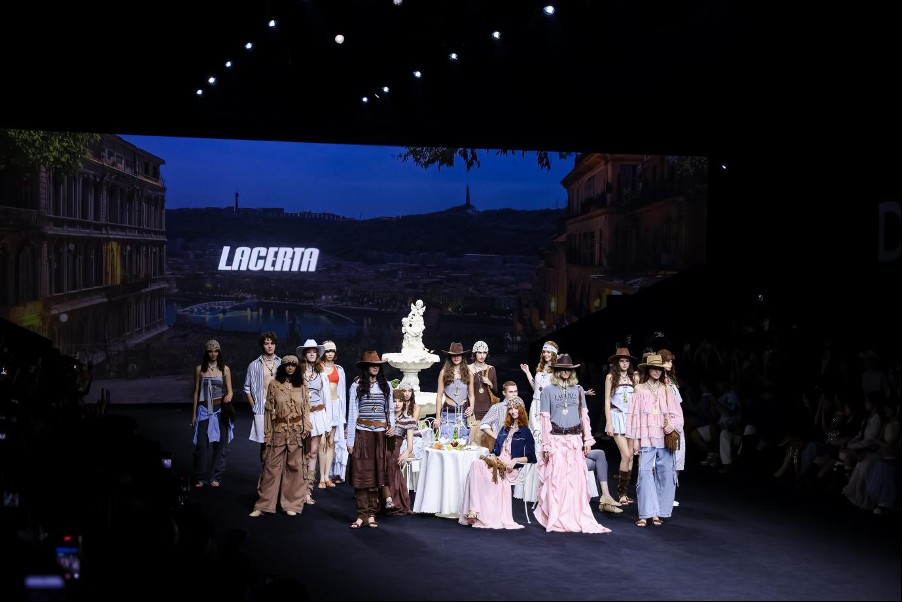 10月12日,下午4点30分。LACERTA莱瑟塔以 “加泰罗尼亚的夏日晚宴” 为主题的2026春夏大秀在上海时装周新天地上演。