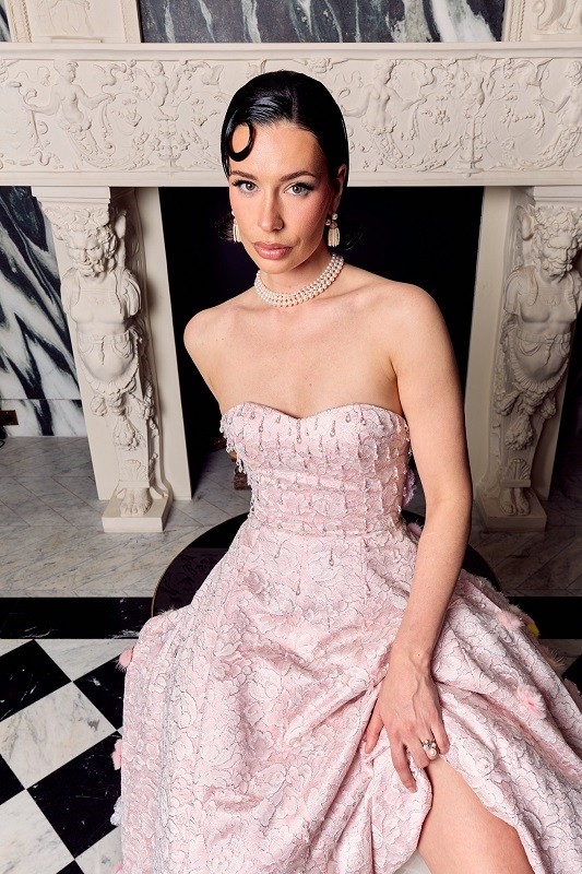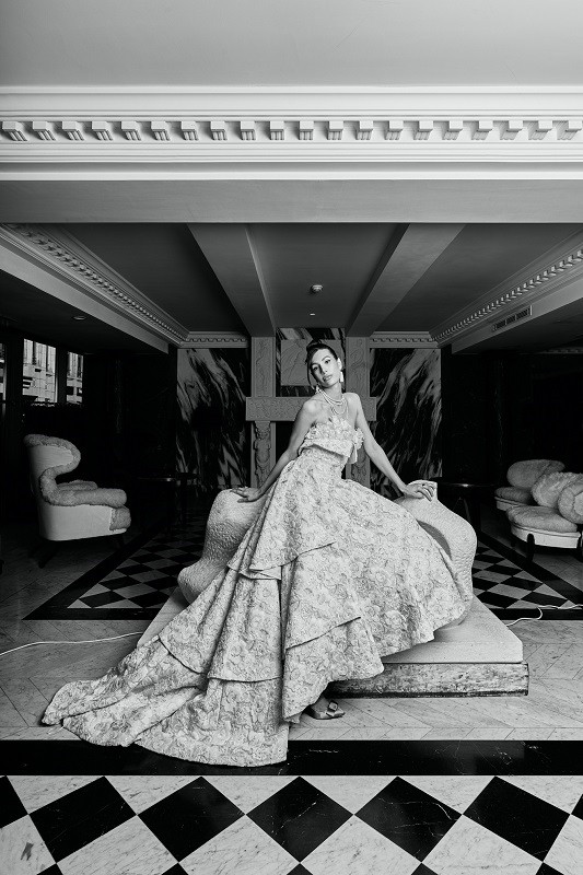 Hotel de Berri 的古典石膏与大理石肌理之间,光线掠过花朵般的层叠裙摆,映衬出一场关于“美的双生性”的对话。LIULISIParis 为摩洛哥世界小姐 Sonia Mansour 定制的粉色花蕾丝礼服,仿佛一朵在静谧中盛放的玫瑰。一面是奢华的诗意与繁花的浪漫,一面是低调的温柔与内敛的力量。YAya镜头定格的时间,如同时间在柔光中凝结,雕塑的冷峻与面料的温度相互呼应。