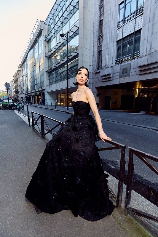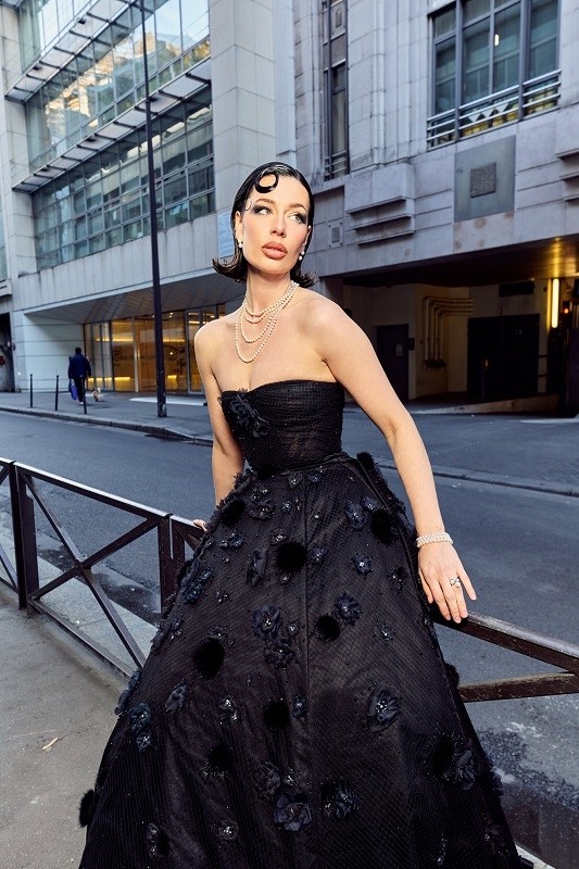 Emilie Boland以复古短发搭配珍珠与钻石首饰,展现出 巴黎式的经典风情:既是黑夜里的高贵女王,又是现代女性独立而坚定的化身。她伫立在巴黎街头,仿佛将都市的历史底蕴与当代时尚精神融为一体。