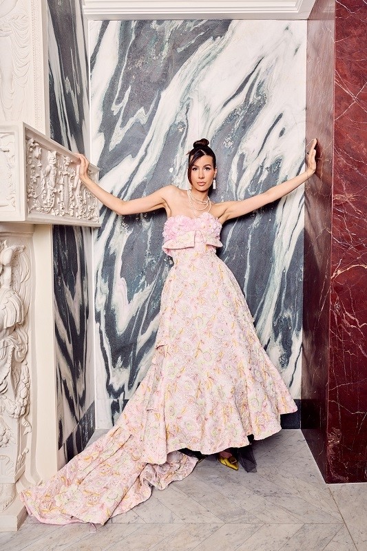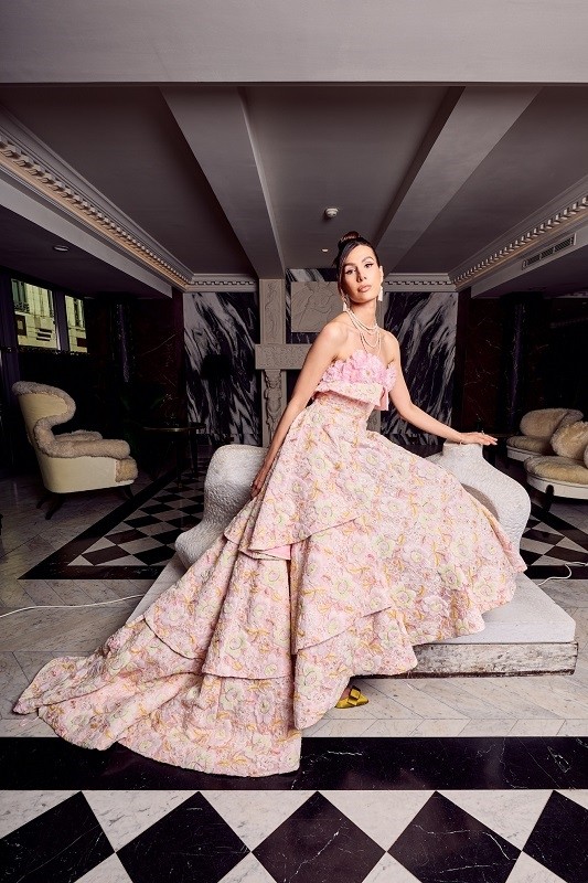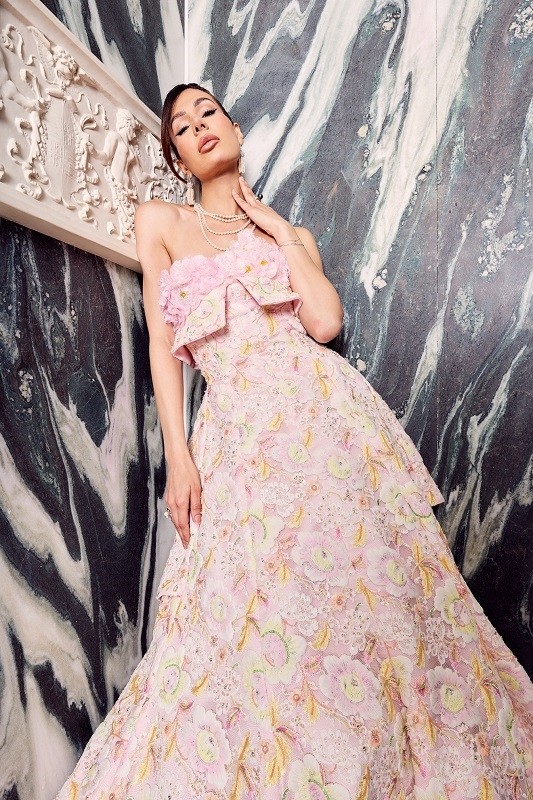 本次LIULISI PARIS为卢森堡世界小姐Emilie Boland打造的粉色立体花卉缎面礼服 宛若一首浪漫的颂歌。上身以简洁的抹胸设计衬托颈肩线条,点缀精致的立体花饰,轻柔却不失华丽。裙摆以层叠式廓形展开,犹如花瓣层层盛放,在步履间流露出灵动的韵律感。