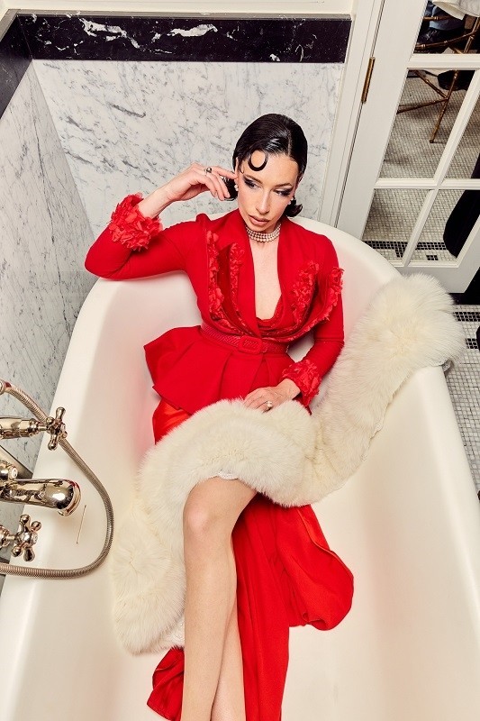 在巴黎的艺术宫殿——Hotel de Berri,一场关于女性炙热魅力与从容气场的视觉叙事悄然上演。身着浓烈红色丝缎礼服的她,静坐于维多利亚式浴缸之中,或倚于精致床榻之间,仿佛电影中的一帧定格画面。光影流转之间,礼服在肌肤与灯光的交汇处闪耀出细腻光泽,仿佛她本身便是一团跳动不息的火焰,象征着热烈、坚定与自信。