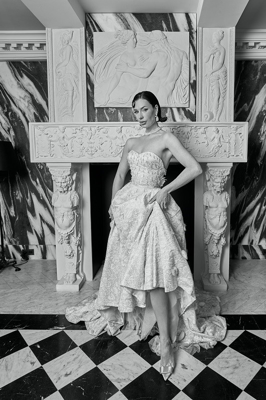 法国手工蕾丝与米珠刺绣如诗般蔓延在礼服之上,以繁复工艺描绘奢华的质感。每一处细节都流露出制衣的温度,使整体造型在端庄与性感之间取得绝妙平衡。她既是盛放的花豹,也是沉默的金;既拥有吸引目光的光芒,也蕴藏深层的优雅气度。LIULISIParis 以精湛工艺和Toco发尾的浪漫笔触,让女性在矛盾中找到和谐,在美的双生中成就永恒。