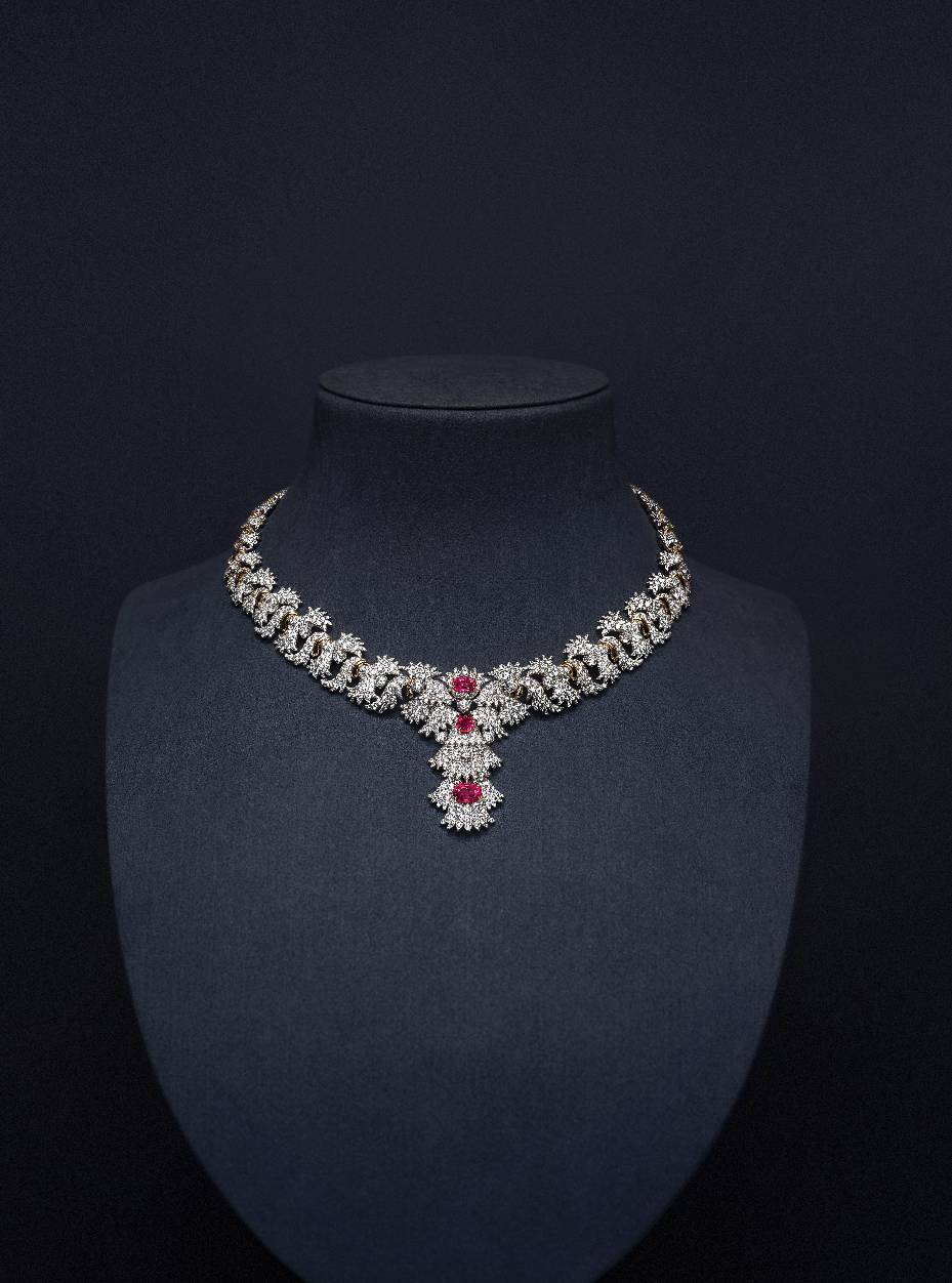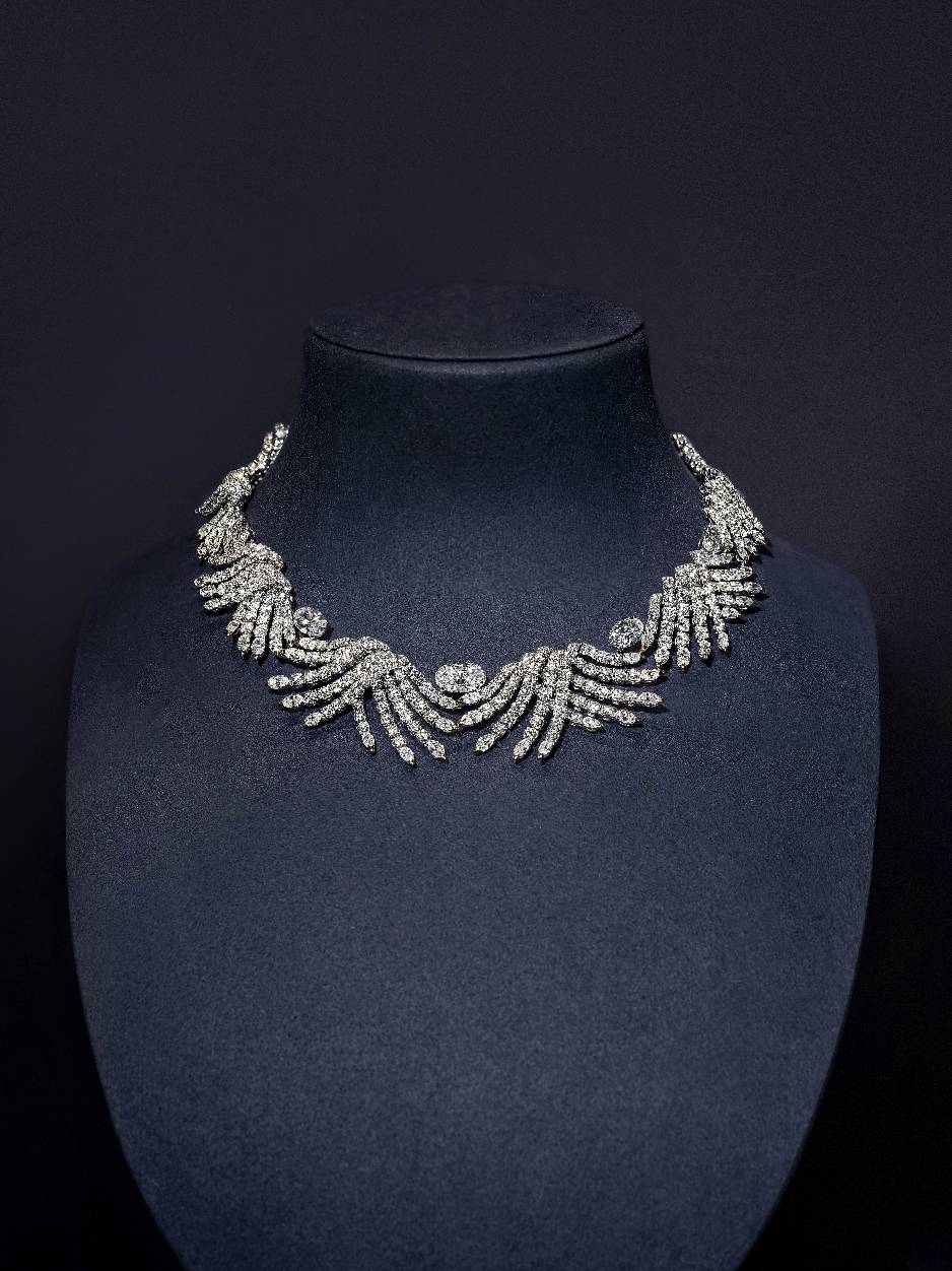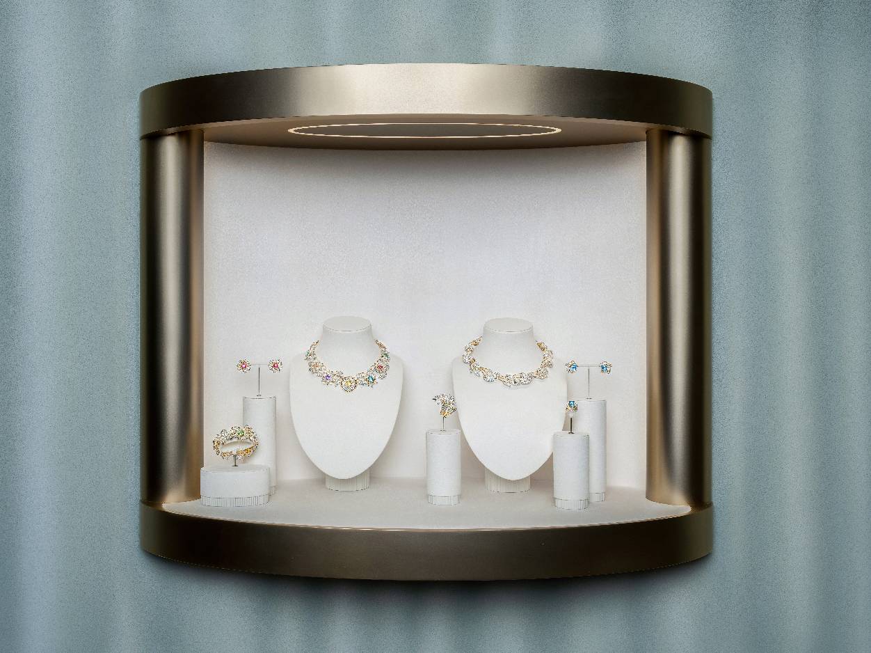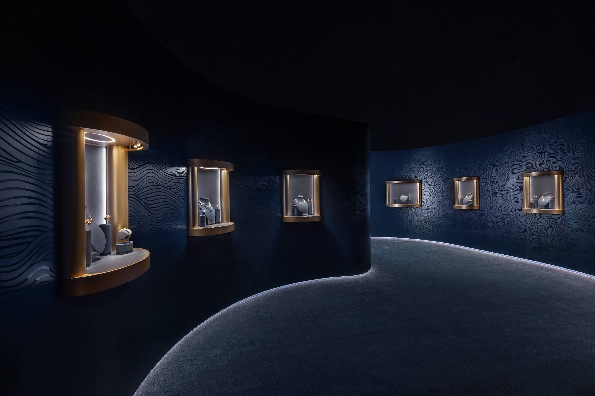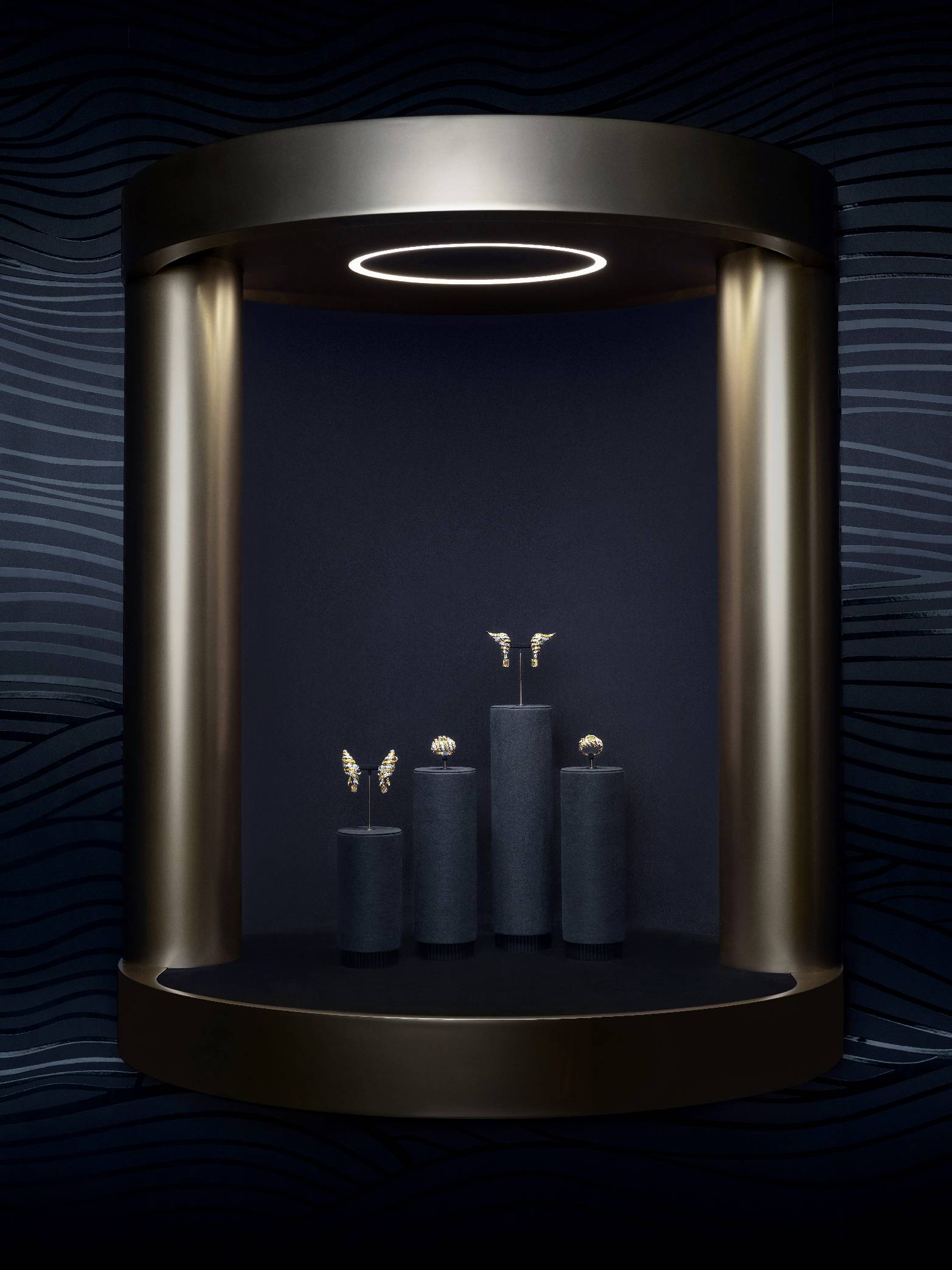 受该系列主题启发,2025 Blue Book高级珠宝系列Sea of Wonder瑰海奇珍作品悉数陈列于深蓝色调与波纹图案交织的空间之中。花舞海葵(Anemone)主题的灵感源自让·史隆伯杰一系列妙趣横生的海葵胸针设计,系列作品洋溢着灵动韵律与奇思妙想,其中一款项链更是在三颗未经优化处理红宝石的点缀下,尤为瞩目。瀚海星螺(Shell)主题以铂金、黄金勾勒蜿蜒起伏的曲线,钻石与黄钻镶嵌其间,再现贝壳自然“隆起”的形态,礼赞自然造物的形态与肌理之美。海灵仙姿(Mermaid)主题则探索美人鱼的韵味风姿,其中一款镶嵌黑色欧泊的项链更是以抽象手法展现美人鱼神秘而梦幻的魅力。每一件作品皆以珍罕宝石与非凡匠艺,焕新演绎让·史隆伯杰对海洋世界的绮丽创想。