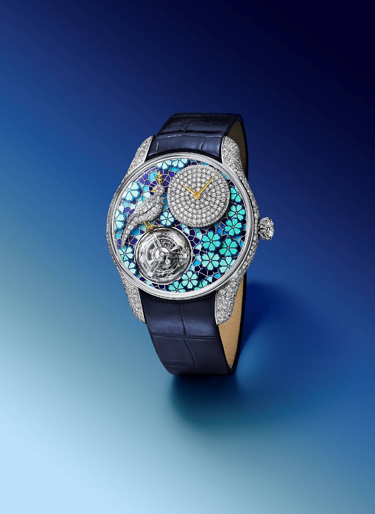 活动现场亦呈现多款以“石上鸟”为灵感的时计佳作。让·史隆伯杰高级珠宝系列“石上鸟”传奇腕表将经典胸针化为微型雕塑,定格一只镶钻小鸟栖息于彩色宝石之上的妙趣瞬间。翻转表背,诗意巧思悄然展露:通过内嵌的放大镜片,可清晰观赏到宝石背面的独特美感,以此致敬蒂芙尼的卓越宝石传承。让·史隆伯杰高级珠宝系列鸟栖花境飞行陀飞轮腕表则集五种精湛技艺于一身,从内填珐琅到微型黄金雕刻,堪称独具匠心的艺术珍品。这款腕表搭载AFT24T01飞行陀飞轮机芯,标志着品牌在高级制表领域的一次重要突破。