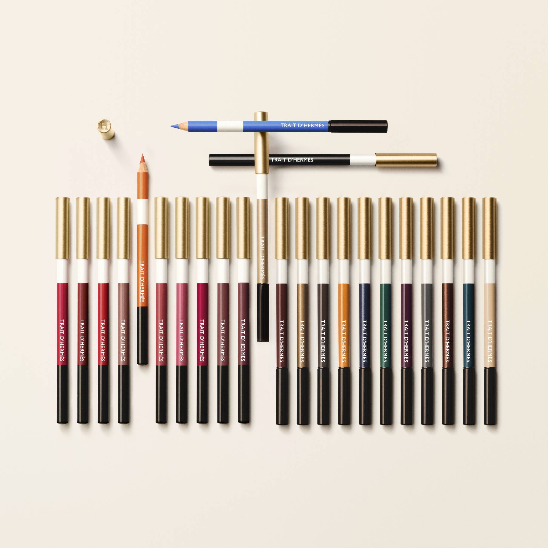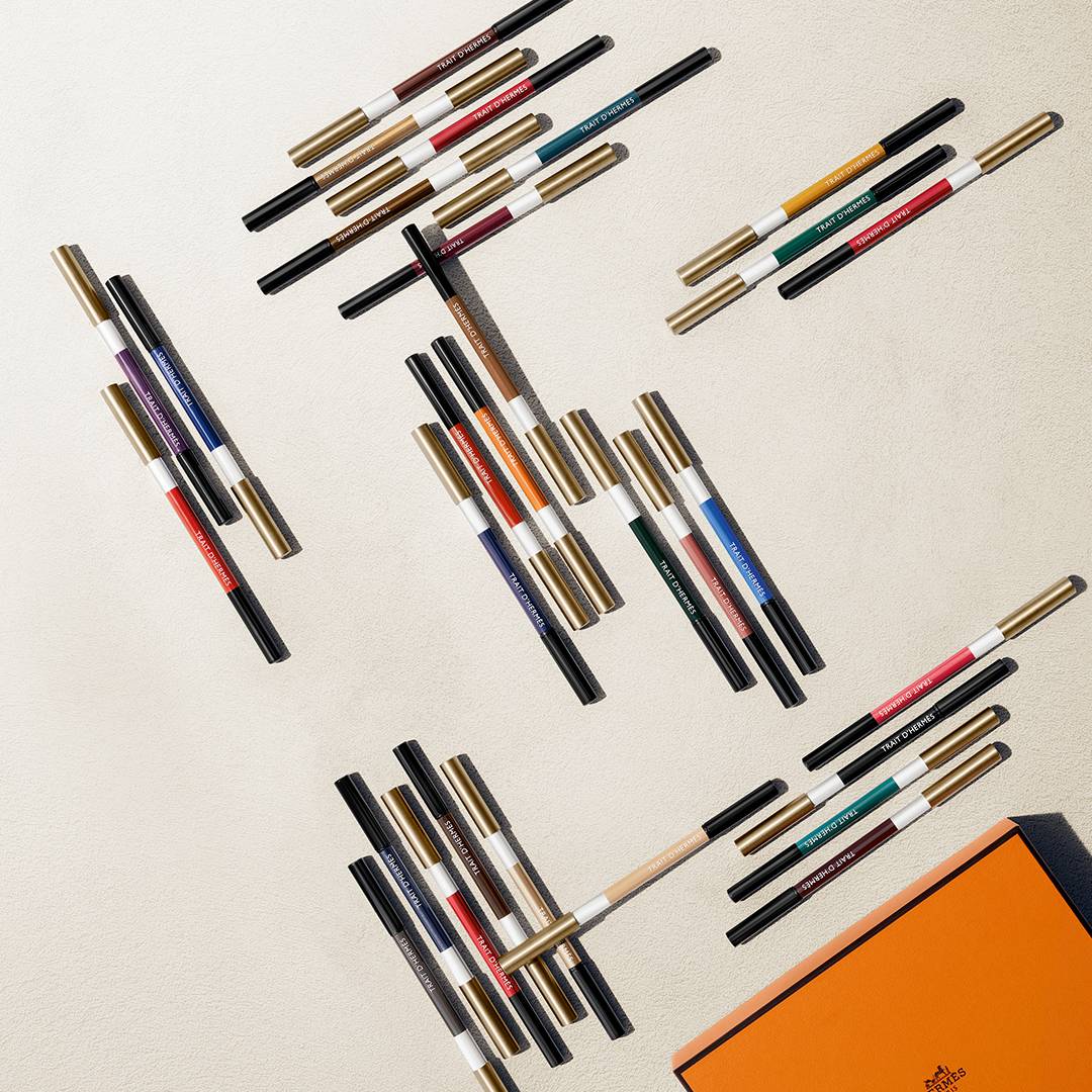 “爱马仕的色彩包罗万象,色调的变幻延伸到了视觉的边界。”爱马仕全球艺术总监Pierre-Alexis Dumas如此形容这一系列。Trait d’Hermès系列颂扬了爱马仕品牌的灵魂——色彩。 该系列中的每一款描彩眼线笔与描彩唇线笔均以由可持续森林木材所制成的笔杆为载体,为眼妆和唇妆提供丰富的 色彩选择。每款作品均配以刻有 造型优雅致敬马术障碍赛中的彩色跳杆。图形感设计配以三色亮泽漆彩,成就这件由精巧纸盒相护的美物。 H字样的金色金属笔盖,由爱马仕美妆产品设计总监Pierre Hardy创作而成,笔杆 “我希望这件看似寻常的物品能独具一格,通过极具几何张力的反差戏法,在白色、彩色和金属之间巧妙碰撞, 达到视觉上的平衡。”Pierre Hardy说道,“核心挑战在于让它与整个美妆系列形成美学上的呼应。”